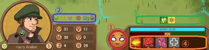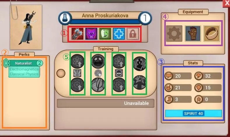 初始状态界面(以安娜为例) 1(红色)为初始可用技能组 2(橙色)为Perk 3(蓝色)为参数 4(紫色)为装备栏 5(绿色)从左到右依次为等级2、3、4、5时可选择的技能,上下两个只能选择其中一个 参数的排列顺序如下:speech、speech defense、attack、armor、move、Grit 在这款游戏的战斗中,不仅有物理攻击,还有说服、恶语等针对精神的攻击(后文详述),因此攻击和防御使用的参数分为这两个系统。Speech是精神攻击,防御精神攻击的是speech defense。Grit是回避力,move是移动力。最右下角的浅蓝色是spirit(生命值)。4种职业各有5名角色。科学家:艾米莉亚、安娜、菲利普、阿加莎、阿弗洛(虚构)共5人。在探险过程中,他们负责发现各种事物,并运用知识拯救队友,是重要的职业。 侦察兵:基维、哈格(虚构)、哈蒂斯、海莉、莫莉共5人。探险中需要速度和机智的场景非常多,这时就轮到侦察兵发挥作用了。 战士:伊万、拜亚、多洛雷斯、让·皮埃尔、维克多共5人。在需要体力劳动和力量的场景中表现活跃,在追求胜利时也很有帮助。 交涉者:希格(暂定)、伊冯娜、玛丽亚、希尔德加德、夸梅共5人。在许多场景中,拉拢当地人或进行说服都非常有效。 “这么说的话,好像所有职业都需要啊。”但是只有3个名额啊,这可怎么办!!以下是我个人的推荐↓ 艾米莉亚或菲利普拥有范围回复技能,队伍里有他们的话初期可能会比较安心。 哈蒂斯和海莉的长距离攻击很好用。 光头的技能虽然使用起来有一定的技巧,但实力很强。 维克多和让·皮埃尔的防御(包括精神层面)特别强,有种不容易被打倒的安心感。 希尔迪和夸梅可以依靠强力的单体回复技能以及强力的增益技能Dance。 ……另外,初期建议尽量让队员持有的Perk(特长)种类不要重复。 (例如:莫莉初始就掌握Rogue2(游荡者2),菲利普初始掌握Rogue1(游荡者1)和Engineer1(工程师1),但)就算带上这两个人,当你觉得Rogue技能可能有用时,实际上也只能让其中一人发挥作用,另一人就会变得多余。不过这也有例外,如果多名队员拥有同一个【Perk】,在某些情况下可能会有利……这取决于具体的战略,但基本上还是避免重复比较好。职业方面,初期最好均衡搭配不同职业,这样应该能应对各种状况(不过这是针对初学者的指南……如果目标明确,据说即使是三名科学家组成的队伍也能冲击高分)。角色参加2~4次探险后,就会解锁作为领队的资格,所以建议从没用过的角色开始依次尝试。其实角色们都设定了“迷信”“贪吃”等不同性格,多亏这些性格,还存在一些特定的事件需要依靠它们才能顺利解决。游戏中甚至还有【帅气胡须】这类属性(真的有),所以选择队员时也要留意这些方面(能不能选到就看运气了)。遭遇战:在探险途中,部分事件会触发战斗(称为遭遇战)。不过并非一定要用武力压制对手,你可以友好地说服对方让路,也可以通过不断嘲讽让对方失去自信,要是这些方法都行不通,那就只能用武力解决了。采用何种策略取决于成员构成和战略规划。态度分为以下三种:友好、诡诈、攻击。几乎所有攻击技能都可归为这三类中的一种。遭遇战开始时,首次使用的攻击方式将决定自身的“态度”。之后,通过反复使用其他技能,可以切换为不同的态度。