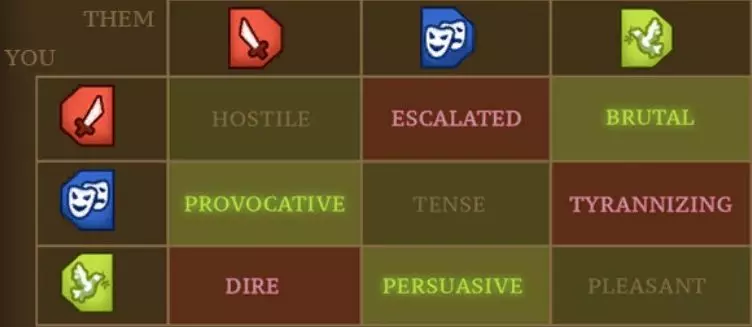 态度的基本遵循“剪刀石头布”原则:友好态度对诡诈态度有优势,诡诈态度对激进态度有优势,激进态度对友好态度有优势。 敌方也拥有“态度”,每场战斗开始时敌方的态度已确定(会因事件不同而变化)。 敌方态度在其每个回合开始时都有可能发生改变。 需要注意的是,态度并非由敌方单个单位决定,而是作为敌方团队整体的属性来处理。 接下来的内容会稍微复杂一些:自身态度与敌方态度共同决定“氛围”。请注意,氛围带来的影响仅会作用于我方成员。