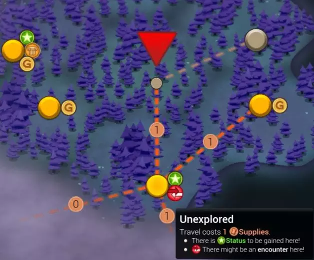 1(红色)角色当前的感情状态 2(蓝色)该角色对该攻击技能的抗性,不同对手之间差异较大,需要仔细确认 3(绿色)显示当前所有生效的增益和减益效果,地形效果等也可在此处确认 4(橙色)若是己方单位,可在此处选择指令;若是对手,则会显示其相关说明,其中可能包含重要信息 初期可以不用太在意感情状态,可将言语攻击视为均包含增益效果和减益效果。当感觉对手开始变得棘手时,再有意识地灵活使用技能为了不让对手占据有利地位,即使在追求友好胜利时,灵活运用诡诈攻击也很有效;同时要善于使用恢复效果,避免我方陷入不利局面。当遇到无法一击制胜的强敌时,在结束回合时也要留意对手的情绪状态。 代币与资源: 探索间隙用于准备的资源,如前所述,在探索过程中无法直接获得(不过也存在能直接获取资源的特殊事件)。 探索中可发现的代币有以下7种: 遭遇(Encounter):战斗胜利后通常能获得2个,根据胜利方式(获胜时的态度)可能获得更多,主要会转化为状态(Status)和金币(Gold)。Collect:收集品,指可以变卖换钱的物品,主要可兑换成金币。金币可在商店中用于购买装备。 Campaign:战役主要转化为声望值。可以使用声望值雇佣随行队员。 研究:主要转化为研究点。可以使用研究点推进研究进度。 接下来是稀有代币,通常无法获得太多。 寻宝:主要转化为黄金和声望值。 秘密:主要转化为声望值和研究点。 发现:主要转化为研究点和黄金。 这些代币如果在探险途中游戏结束,将不会被计入分数,所以无论如何都要活着返回。 成功返回后会说明这些资源的用途。 要在探险中生存下来