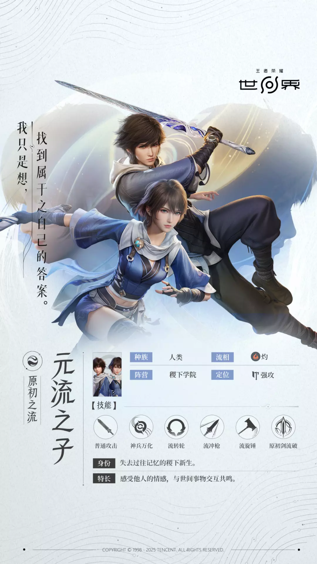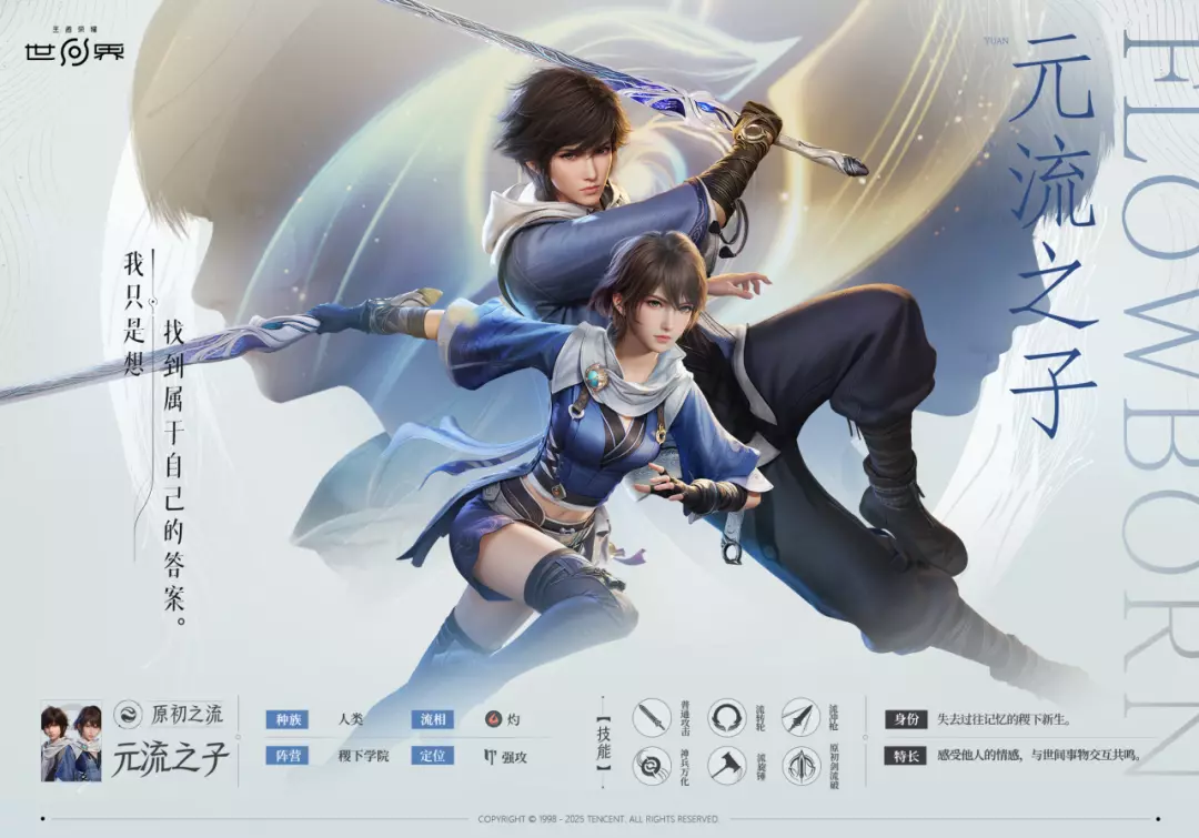 这是《王者荣耀世界》里元流之子的共鸣档案,元流之子是失去过往记忆的稷下新生,曾迷茫怀疑,最终学会掌控自己的“流”,以强攻定位的身份,寻找属于自己的答案。