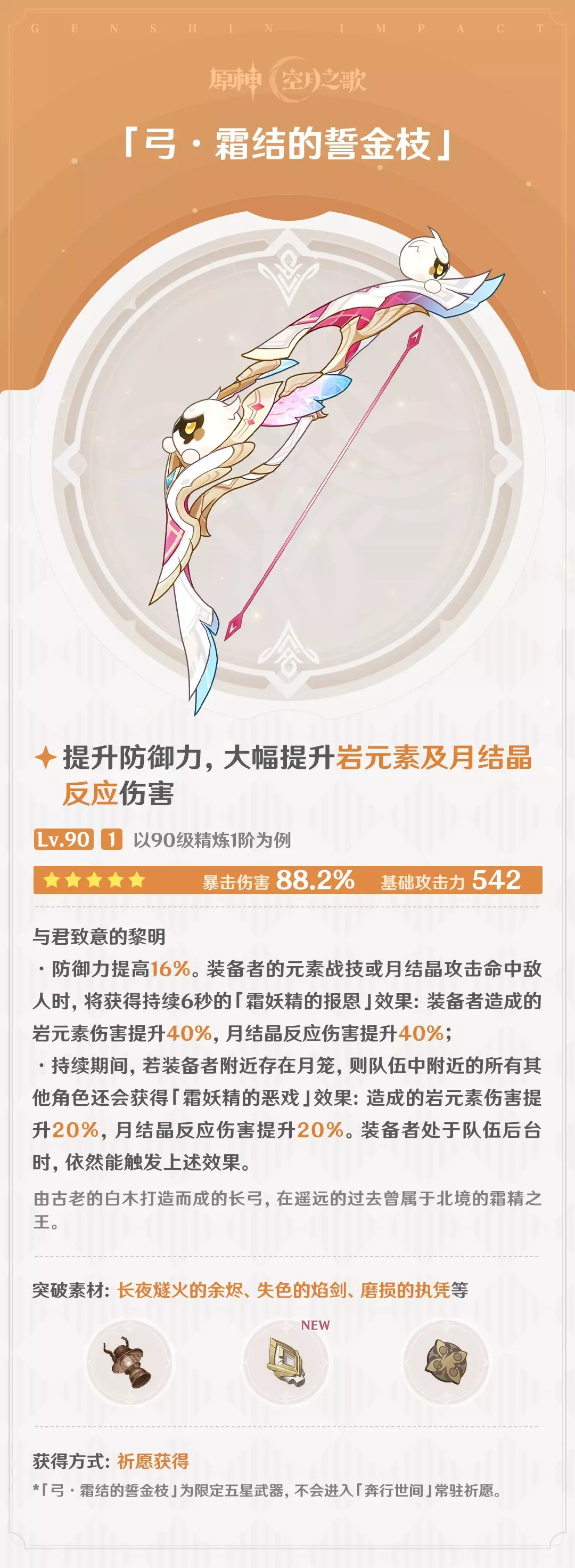 原神「月之六」版本将上线全新限定五星武器「弓·霜结的誓金枝」,该武器可提升防御力、岩元素及月结晶反应伤害,4月8日更新后开启的「神铸赋形」祈愿中,其获取概率将大幅提升。