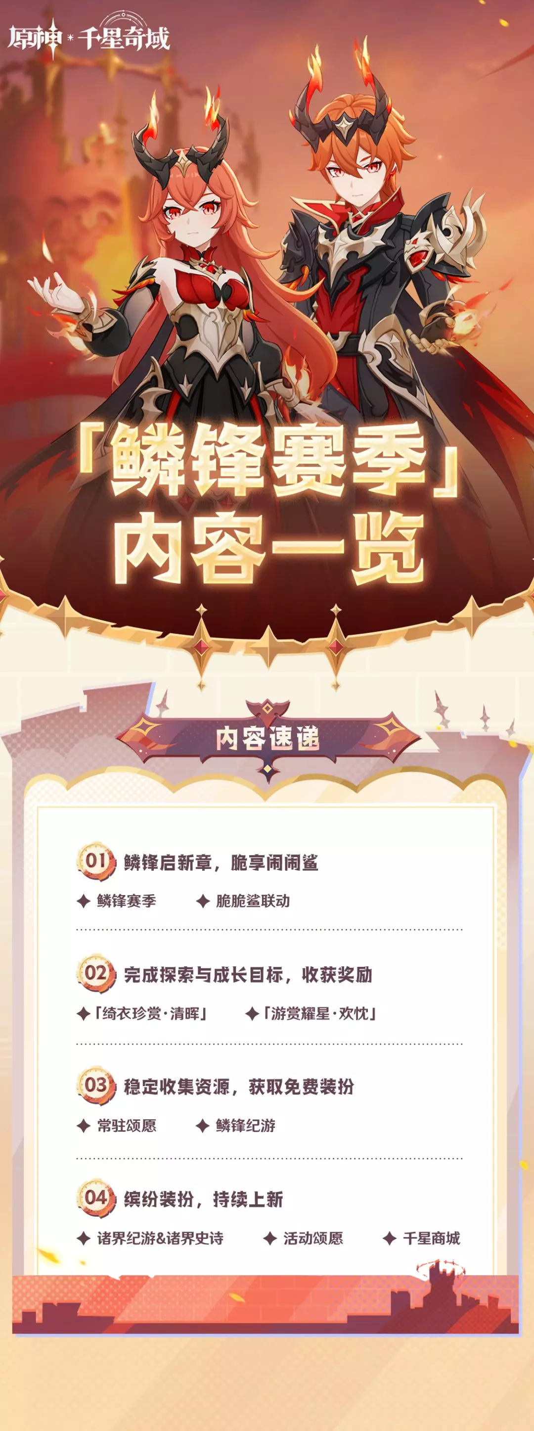 旅行者好呀,欢迎来到「千星奇域」。「鳞锋赛季」即将开启,一起来看看新版本中有哪些福利和活动吧!