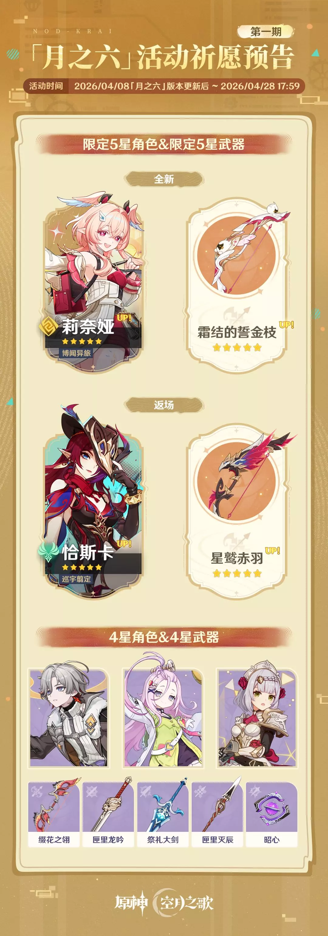 本期活动祈愿时间为2026/04/08「月之六」版本更新后 ~ 2026/04/28 17:59。