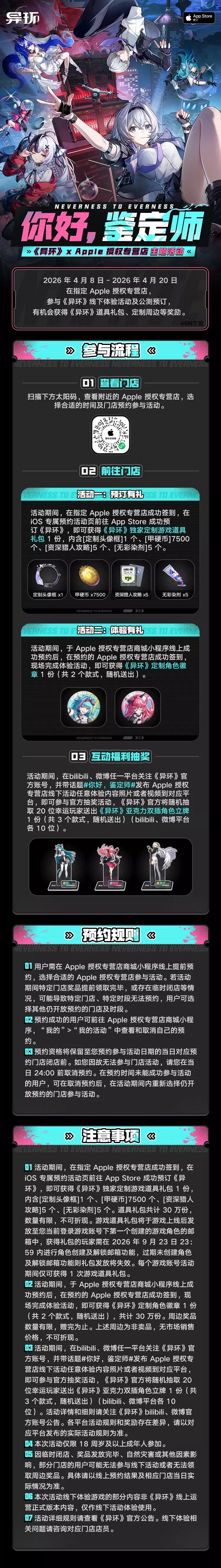 《异环》公测在即,携手Apple授权专营店预订送好礼!预约门店参与线下体验活动及公测预订,有机会获得《异环》定制角色徽章、活动独家定制头像框等奖励~