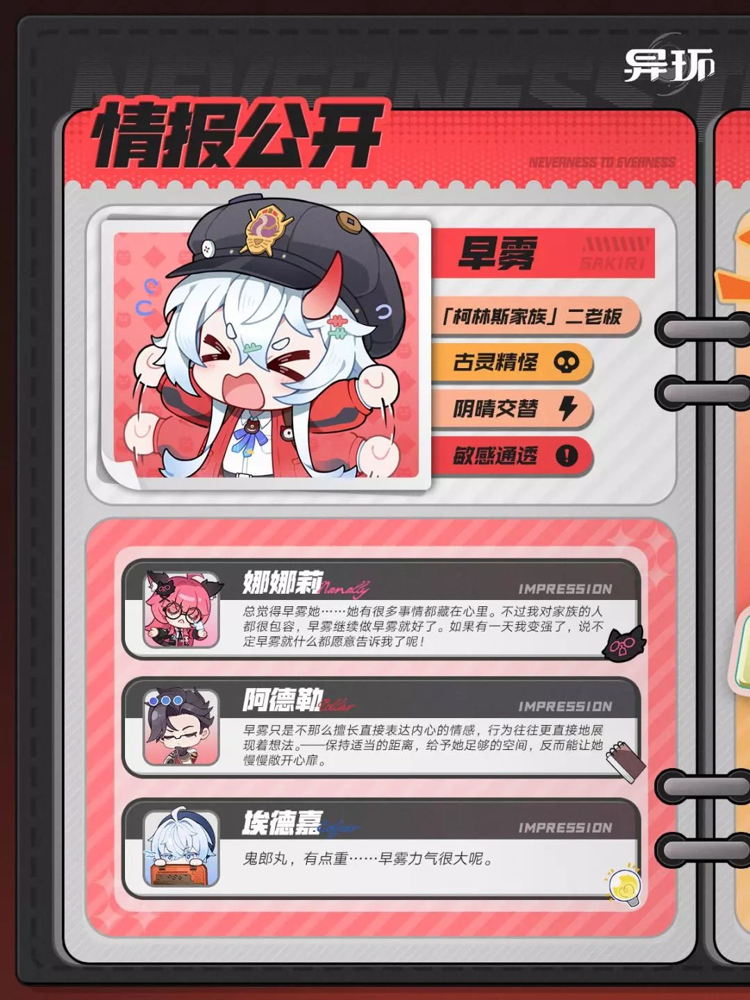 这是游戏《异环》的角色情报帖,公开了「柯林斯家族」二老板早雾的性格特点,还有娜娜莉、阿德勒、埃德嘉对早雾的印象,同时展示了早雾嘴硬心软买小熊棒冰的趣味互动内容。