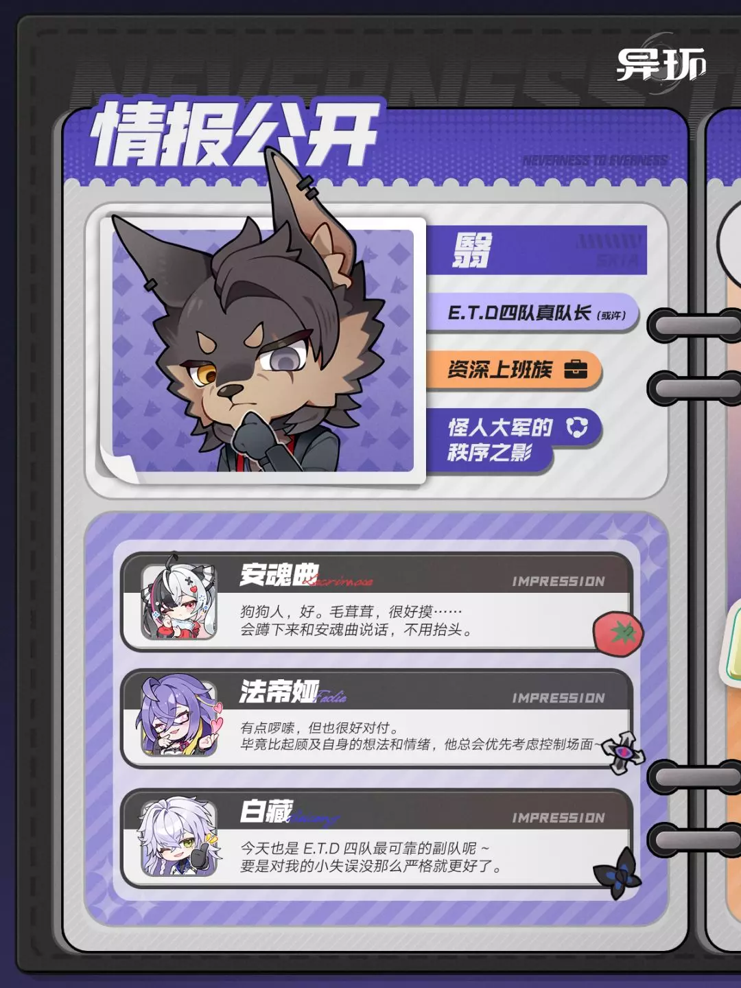 这是游戏《异环》的角色翳的情报公开内容,介绍了翳是E.T.D四队真队长,还展示了安魂曲、法帝娅、白藏对他的印象,同时呈现了翳在任务间隙纠结后选择休息的闲趣时光剧情。