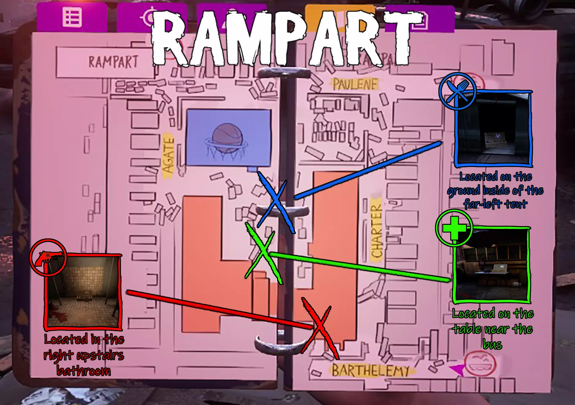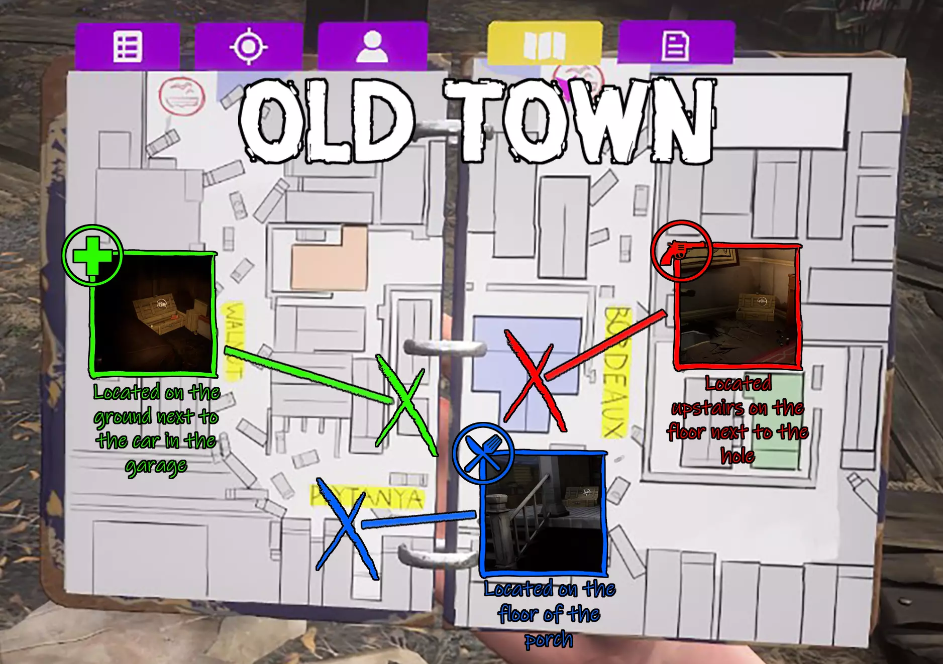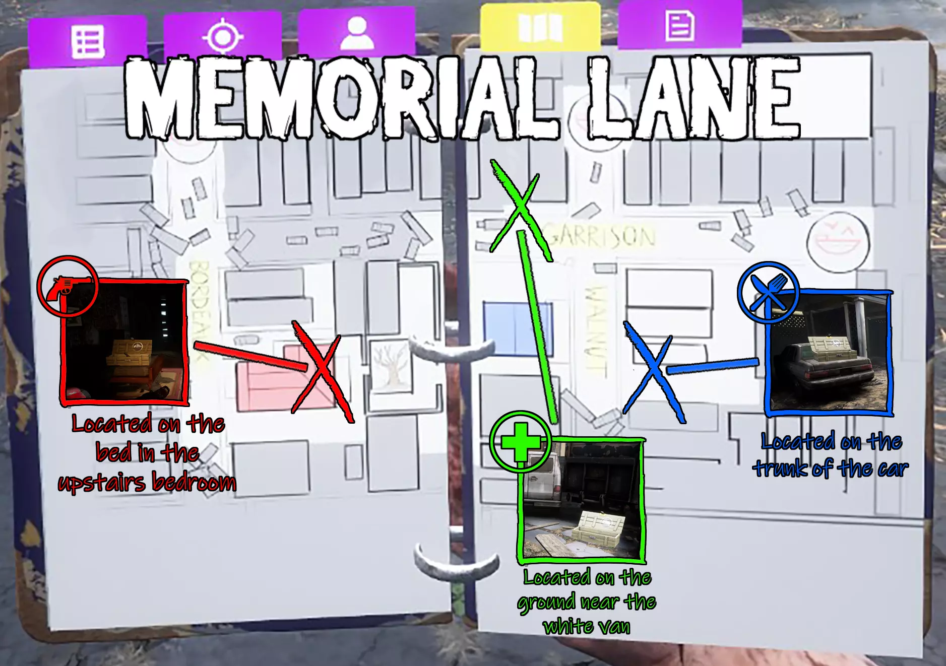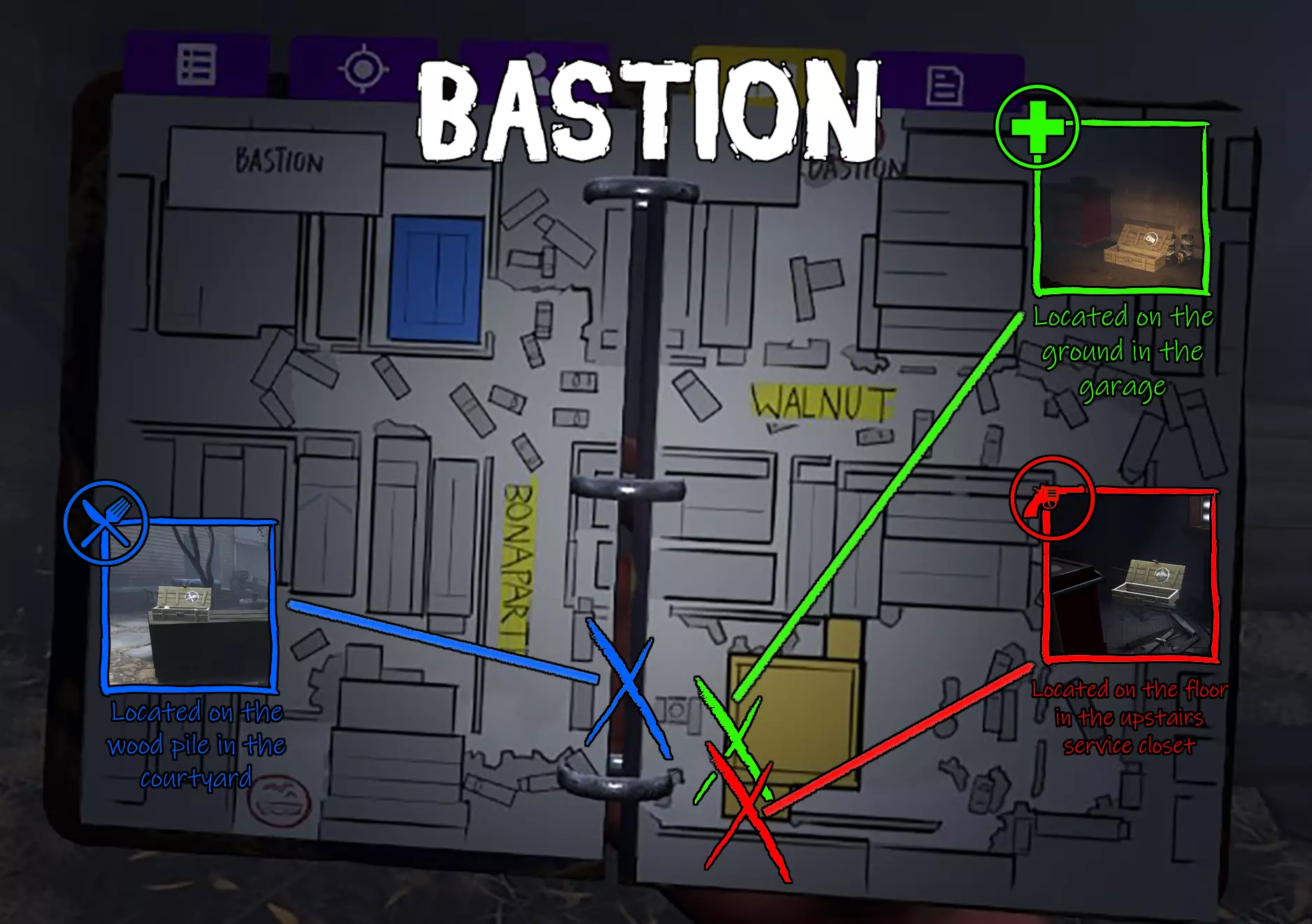 本指南详细介绍了游戏中每张地图的武器、食物和药品藏匿点位置! 简介 温馨提示 - 藏匿点位置固定不变。无论何种藏匿点,都会100%出现在固定位置。 以下是每张地图的图片,藏匿点位置用彩色方框标注。 (参考说明) 红色 - 武器藏匿点 蓝色 - 食物藏匿点 绿色 - 药品藏匿点 X标记处即为藏匿点位置 浅滩