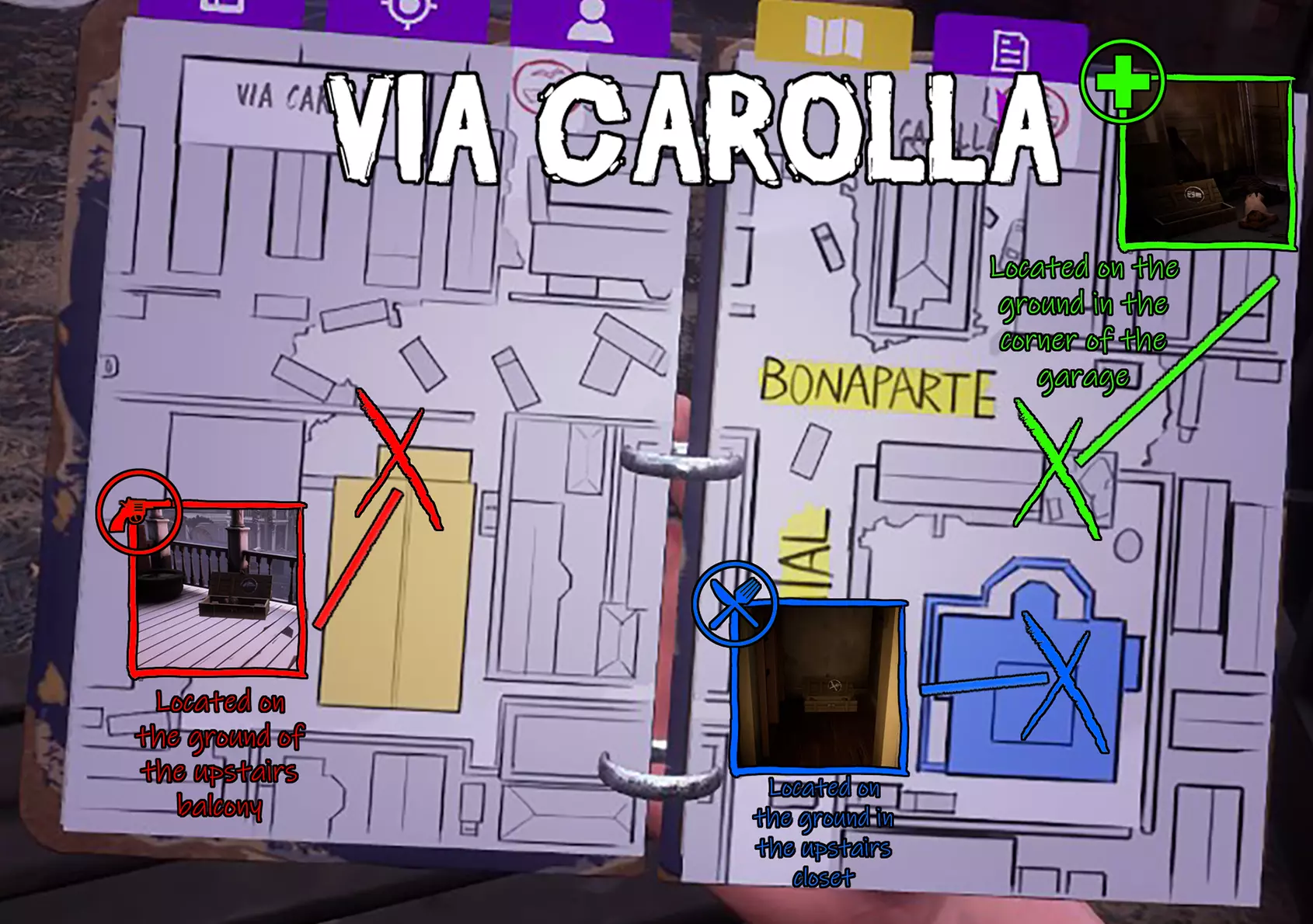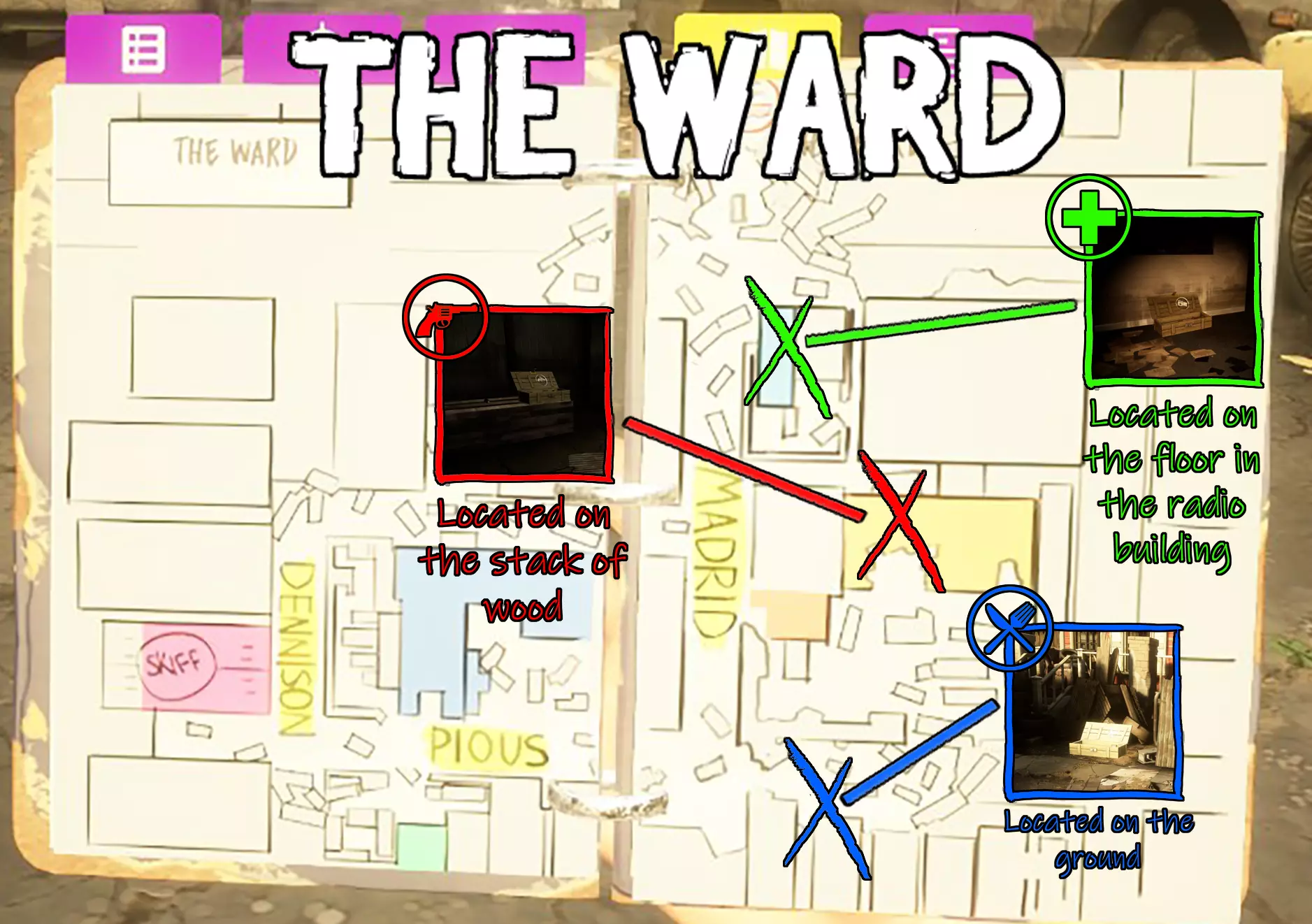 这是一份游戏物资藏匿点指南,标注了浅滩、卡罗拉大街等多张地图里的武器、食物、药品固定藏匿点,用不同颜色方框区分物资类型,还配有实景图说明具体位置,方便玩家快速找到游戏物资。