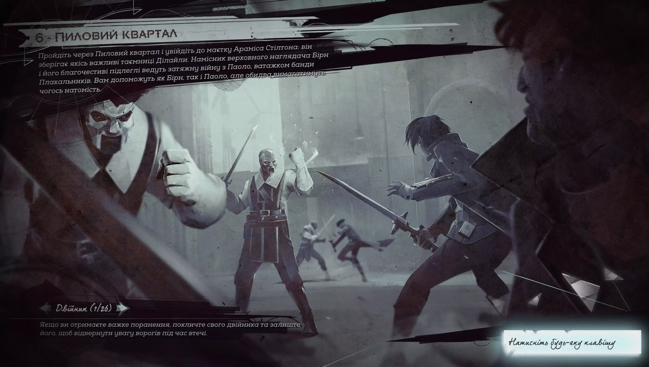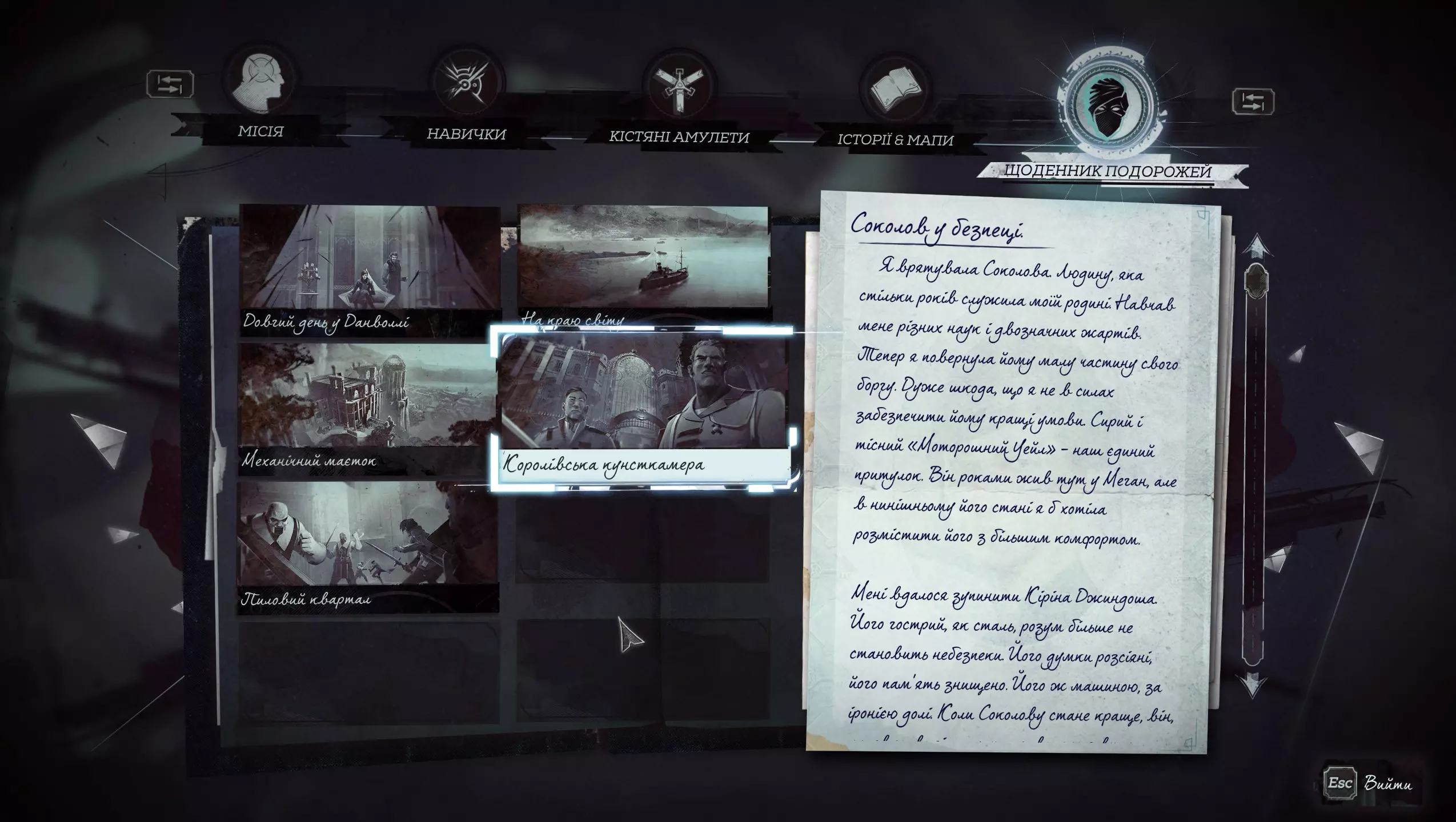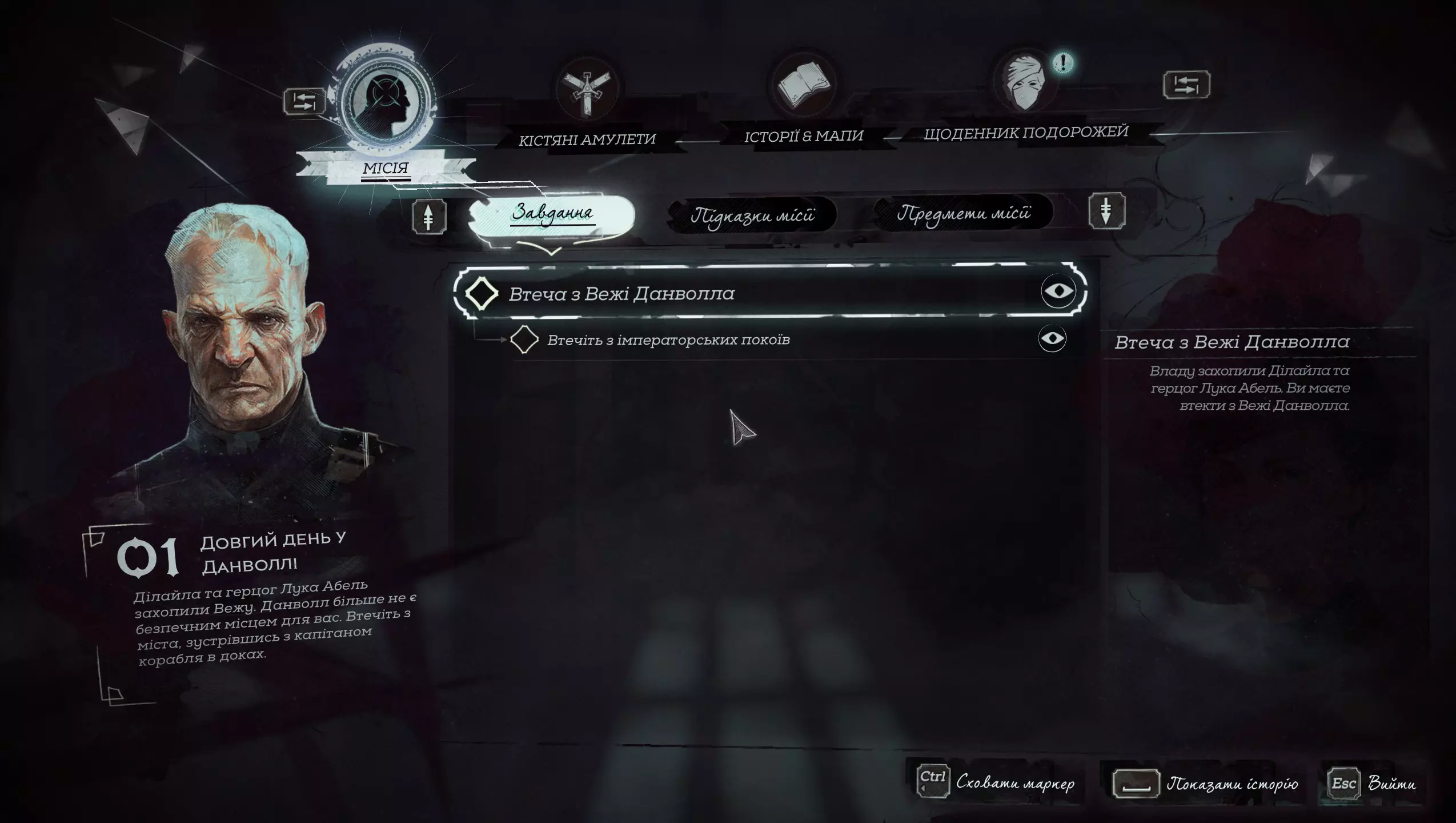 大家好! 我不从事翻译工作,但喜欢玩带有乌克兰语本地化的游戏。 这是机器翻译,但经过人工编辑。我利用空闲时间独自制作,所以进度不快,可能会存在错误,之后我会进行修正。如果: - 我自己发现错误 - 您在我频道的视频评论中告知我 - 您通过截图在相关平台告知我 本视频展示了编辑后的翻译示例。今天(2025年4月1日)已完成“测试版”的全部编辑工作。本地化更新日期将在YouTube视频下方或Discord中注明。 感谢 非常感谢以下人员的帮助: 字体开发 - art-kandy 技术咨询 - 界外魔一号 编辑 - 安东 问题 游戏没有资源工具,所以我自己制作了。由于缺乏游戏引擎的文档/信息,有些内容修改不正确,并且我知道有一个小问题。在游戏新启动以及尝试加载存档、开始新游戏或加载单独任务时出现问题——游戏会崩溃。 更新:如果仍然崩溃且无法游玩,这里提供一个使用原始字体的解决方法,其中字母“іїєґ”将替换为其他符号。 如何安装? 0)建议先备份游戏文件——即“.. SteamLibrary steamapps common Dishonored2 base”目录下的game1*..文件。1) 游戏需选择语言 - 英语 2) 下载压缩包 3) 将其解压到游戏文件夹,例如".. SteamLibrary steamapps common Dishonored2",解压后应出现".. SteamLibrary steamapps common Dishonored2 importFilesToSteam.exe"和".. SteamLibrary steamapps common Dishonored2 importFilesData.bin" 4) 运行游戏文件补丁:Steam版本 - importFilesToSteam.exe,Epic版本 - importFilesToEpic.exe(未测试) 5) 等待几分钟在进行更改的过程中,会显示一个包含文件列表的控制台。文件数量非常多,因此您会注意到更改过程。 如果进程在第一个文件上“卡住”,说明您使用的不是Steam版本,或者存档与Steam/Epic版本不同。这种情况下,您将不得不恢复游戏的原始文件。 示例