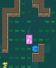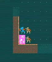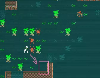 回来! 这是一个尖牙兽猎人向我射击的例子。如果我朝他们跑去,他们就会一直向我射击。第二个问题是新玩家一开始没有意识到的。一些远程攻击者的AI会尽可能保持远程距离,并从你身边撤退。如果你盲目地继续追击,最终会进入不熟悉的区域,可能会被他们那些好杀的同伙从侧面偷袭。所以我们不要这样做! 这里的粉色方块是我选择等待的位置。在这个位置,你会处于尖牙兽的视线之外(这意味着你也看不到它们)。等待几个回合,然后……