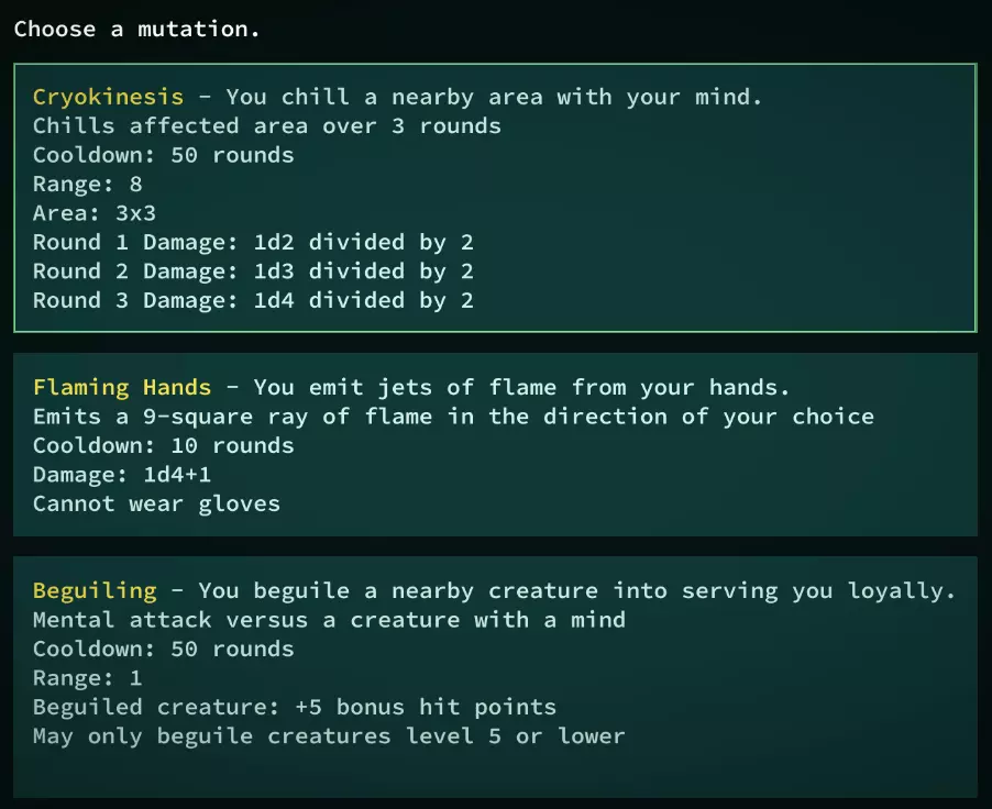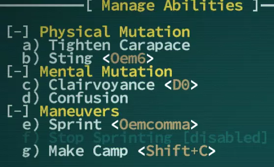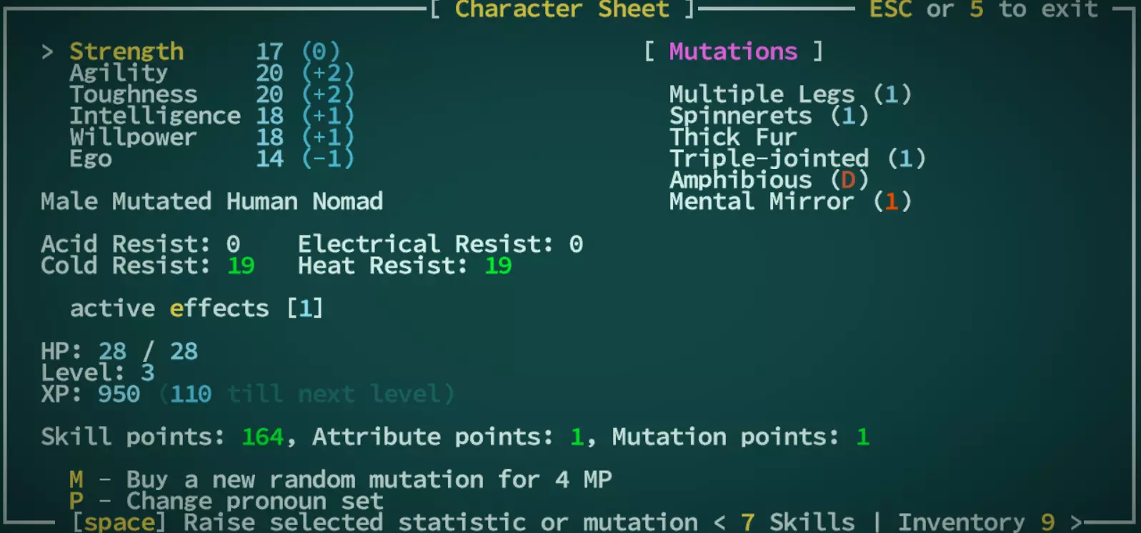 角色界面! 大部分界面在你了解了基础属性和抗性后就会变得直观易懂。不过你来到这里的主要目的通常是提升突变等级和增加属性点。 每3级会获得1个属性点。 每6级,所有属性会自动+1。 如果你是突变体,每次升级会获得1个突变点。 要提升属性,将光标(>)移到你想增加的属性上,按空格键选择即可。提升突变等级的操作方式相同,但需要按右键将光标移到突变列表。即使没有可分配的点数,选中突变时也会显示其效果说明以及升级后的变化。如果你查看心灵镜像,会发现它的等级是红色的1级。这是因为我的角色有-1的自我修正值。心灵镜像的实际等级其实是2级,但由于它是心灵变异,而所有心灵变异的等级都会受到自我修正值的影响,所以变成了1级。不过,你手动提升变异等级最高只能到10级。 变异还有另一个限制:你不能将某个变异的等级提升到超过你角色等级的一半。你可以把点数用在其他变异上,或者攒起来购买新的变异! 购买新变异