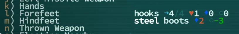 当你拥有诸如多腿或双头这类赋予你多肢体的变异时,装备在这些肢体以及其他类似身体部位上的装备的AV和DV会取平均值(向下取整)。红色表示该属性受到负面影响,绿色则表示由于取平均值,负面属性有所减轻。以图中情况为例,因为钩子是0AV 0DV,钢靴是2AV -3DV,所以角色最终的平均值为1AV和-2DV。 这一设定是为了避免多肢体角色获得比普通肢体数量角色高出一倍的AV和DV。这种平均化仅适用于AV和DV!不适用于装备的任何额外加成。 为什么我的 armor 显示【破损】? 这是当你与使用斧类武器的敌人战斗时发生的情况。上次战斗时,你可能见过这个弹窗。