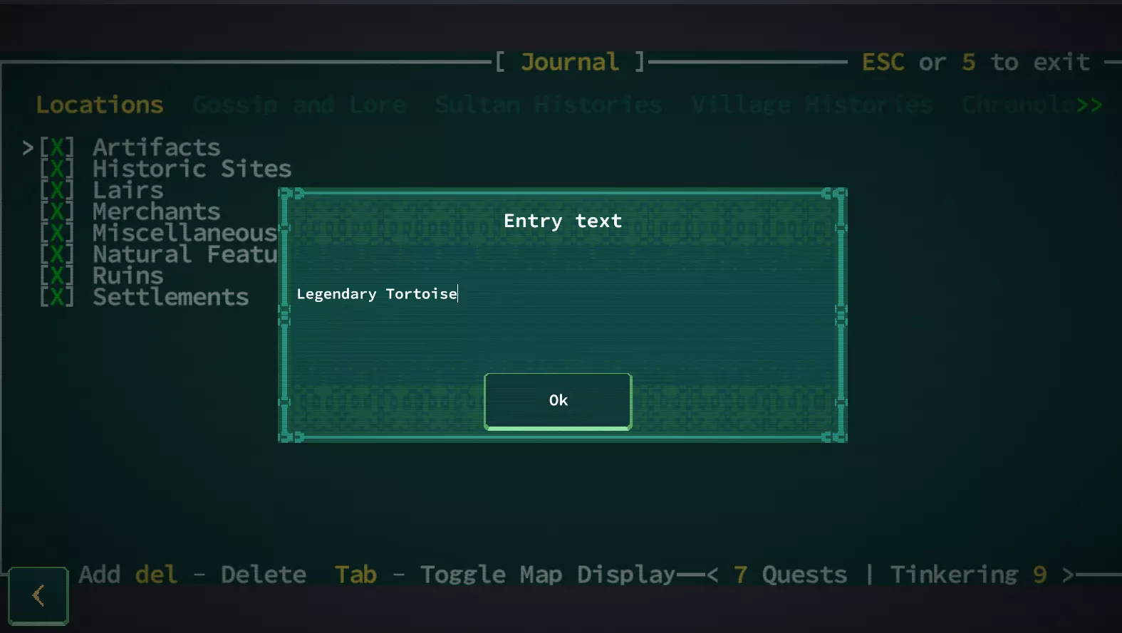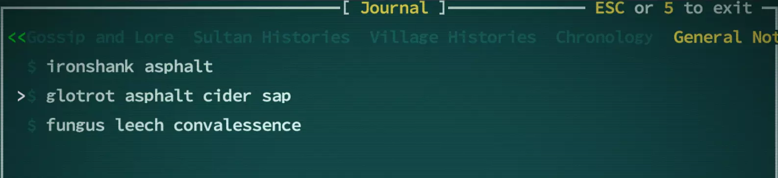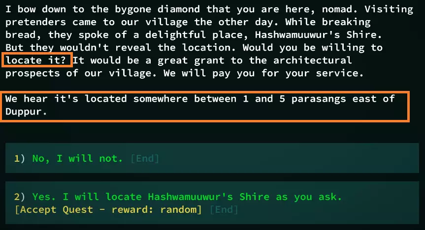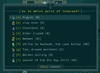 Qud的世界充满了诸多秘密与隐藏遗迹。日志会记录其中大部分内容,而且这些秘密似乎总会带有绿色的【$】标记。 这个标记是快速指示器,用于显示你是否已通过水之仪式与他人分享了该秘密。绿色表示该秘密仍可交易(但仅限对其感兴趣的人),灰色则表示已被分享出去,并会附带脚注说明分享给了哪个派系。秘密是另一种形式的货币,所以如果你计划与某个派系进行水之仪式,务必储备好重要的相关秘密。 如何接取随机村庄任务? 如果你不想从Joppa开始游戏,那么你将在一个随机生成的村庄中开始,并获得两个随机生成的任务。由于这些任务具有随机性,其难度可能会有很大差异。与本FAQ的其他部分相比,本节更像是一个攻略指南,但这个问题非常常见,因此我至少可以概述一下完成这些任务的基本策略。 特别感谢eva problems在Qud相关社区中提供了大部分此类策略! 如果你不知道“帕拉萨格”(parasang)是什么,请务必查看标题为“如何阅读世界地图”的部分。 寻找任务发布者 对我来说,这实际上是任务中最难的部分。初始村庄会有两个任务,而你之后找到的任何村庄都只有一个任务。与大多数村民交谈时,他们会有“这附近有活儿干吗?”这样的对话选项。这会显示他们的名字,但除非你查看每个村民的名字,否则没什么帮助。随着你游玩时间的增加,你会了解每个派系的命名规则,这样通过生物类型来寻找任务发布者会稍微容易一些。不过,对于那些没有数百小时游戏时长的玩家来说,有一个更简单的方法:按退格键! 按退格键会打开一个菜单,让你前往(已发现的)兴趣点,其中包括任务发布者。试试看!如果你知道要找什么,他们在视觉上也能被区分出来: 任务发布者通常是黄色名字的村民,他们有名字,但不能进行水之仪式。 第二种任务发布者是村庄里指定的“重要”人物,通常是红色或紫色名字。这些是你可以进行水之仪式的对象。 村庄里的修补匠也能给予任务!他们都是青色的。 这些是最常见的任务给予者,但我也见过一些罕见的例外,比如村庄商人,他们通常是德罗马德人(骆驼人)或黄色的。 有时这些颜色可能会因为生物的突变或外观而被覆盖,所以一定要按(L)键查看名字是否匹配!他们也会尽量避免移动。 我应该接这些任务吗? 由于随机性,有些任务确实很难完成。可能是因为被迫前往充满强大敌对生物的巢穴,或者你必须搜索的区域难度等级过高。(查看附录中的危险等级部分。)(对于那些想对生物群系难度保密的玩家来说可能会有轻微剧透!)你随时可以在准备更充分后再回来。 解析任务 向任务发布者询问“如果有工作要做,我可以提供服务。”或“这附近有工作吗?”,会在询问你是否接受任务之前,先给出一小段程序生成的精彩内容。