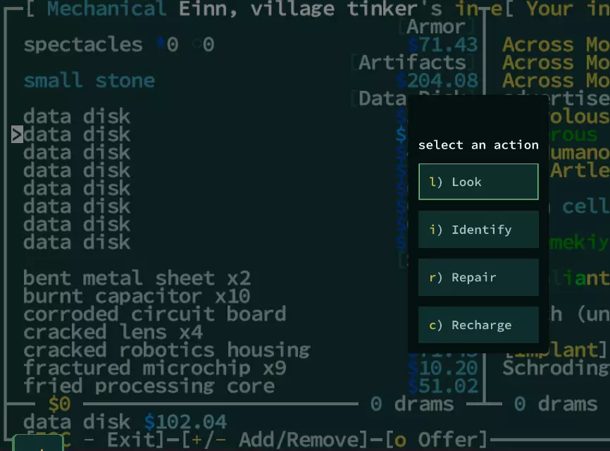 修补匠通常是你初始村庄里浅蓝色的角色。你可以与他们交易,方法是按【Enter】键选中你想要的整堆物品,然后按【O】键。不过他们还有一些大多数人不知道的其他功能。在物品上按【空格】键会打开额外选项对话框: 你也可以直接使用这些快捷键,无需先按【Tab】键。这些选项可用于你和修补匠 inventory(背包)中的物品。如果你自己无法修理或充能物品,就好好利用这一点吧!工匠热键快速参考 按键 操作 i 鉴定未知神器 r 修理损坏或破裂的物品 c 为空能量电池充电 使用ALT键 这是一个我最近才发现的功能。如果你难以发现敌人或可互动的物体,这个按键就派上用场了。