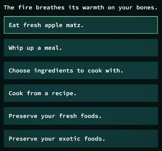 退格键对于那些在迷宫般的随机生成村庄中探索的玩家来说是个强大工具。当你探索完城镇后(最好使用自动探索功能),可以按下【退格键】调出一个菜单,让你自动寻路前往这些兴趣点。这些兴趣点包括: 商人 任务发布者 独特NPC 工匠 楼梯 烤箱 箱子 带有新传说的彩绘/雕刻物品 等等 这能极大节省时间,所以我强烈建议你尽可能多地使用它! 浅尝烹饪 你的角色不仅会口渴,还会感到饥饿。烹饪显然比喝些淡水要复杂得多,以下是烹饪的简要概述。 如何烹饪