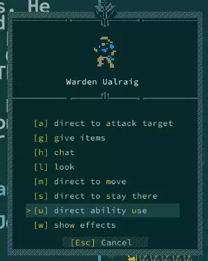 动作 描述 直接攻击对手 重新打开观察界面,你可以用空格键选择希望追随者攻击的目标。 给予物品 (仅相邻时可用)本质上是交易菜单,但无需金钱交换。追随者通常会装备你给予的物品,所以要确保你不介意他们穿戴这些物品! 指挥移动 该追随者会移动到观察界面中指定的位置。不过需要一回合左右才会开始行动。 重命名 如你所料。 指挥原地待命 该追随者会待在原地,除非附近出现敌对生物。如果在命令追随者停留后离开当前场景,他们将不会跟随你进入新场景。 直接使用能力:该追随者会移动到你指定的位置。不过他们需要大约一回合的时间才会开始行动。 直接移动:切换追随者可以/不可以使用的能力。如果你有一个拥有诸如力场墙或力场泡泡等烦人或难以配合的突变能力的追随者,可以考虑在此处将这些能力关闭。