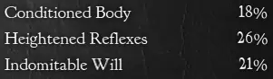 强健体魄 - 减少你处于流血、燃烧、中毒和变形状态的时间。 敏锐反应 - 你的暴击伤害增加此百分比。 不屈意志 - 你有几率忽略控制效果,如变形、诅咒、恐惧、游侠突袭和眩晕。 防御优先,护甲/护盾