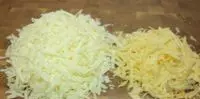 第一个总是固定的,那就是披萨用马苏里拉奶酪。是专门用于披萨的,而不是盐水里的那种。这是因为它的奶酪味更浓郁,所以我更喜欢用它来做披萨。第二个奶酪我建议添加你个人更喜欢的种类。就我而言,我会选择高达奶酪。
