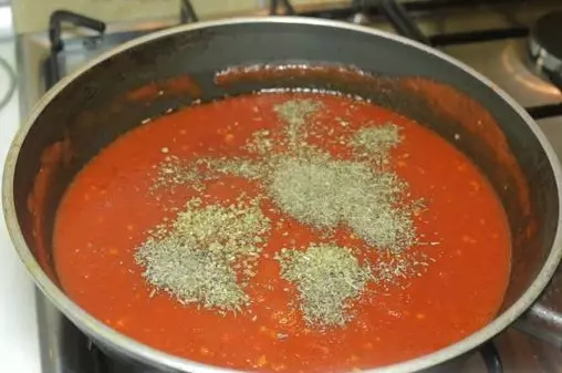 在面团发酵期间,我们来准备披萨酱。为此,将2瓣大蒜去皮并切碎。在加热的锅中倒入植物油。向锅中加入400毫升带汁压碎的番茄。立即向番茄中加入盐、现磨胡椒粉和大蒜。搅拌所有食材并将酱汁煮至沸腾。尝一下味道。有时买到的番茄会带点酸味,所以需要在酱汁里加糖来平衡口感。具体加多少糖我就不建议了,按个人口味来就行。 现在该给酱汁增添真正的意大利风味了!往锅里加入1茶匙牛至和1茶匙罗勒,搅拌均匀。调小火,把酱汁煮到想要的浓稠度,这大概需要15分钟。为了不浪费时间,我们先准备奶酪——用擦板擦碎。为了让披萨尽可能美味,我会使用两种奶酪。