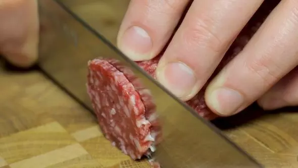 我们来处理制作意大利辣香肠披萨最重要的食材——意大利辣香肠。这种香肠不是随处都能买到,但没有它就做不成这道披萨,所以必须找到它! 把香肠切成薄片。