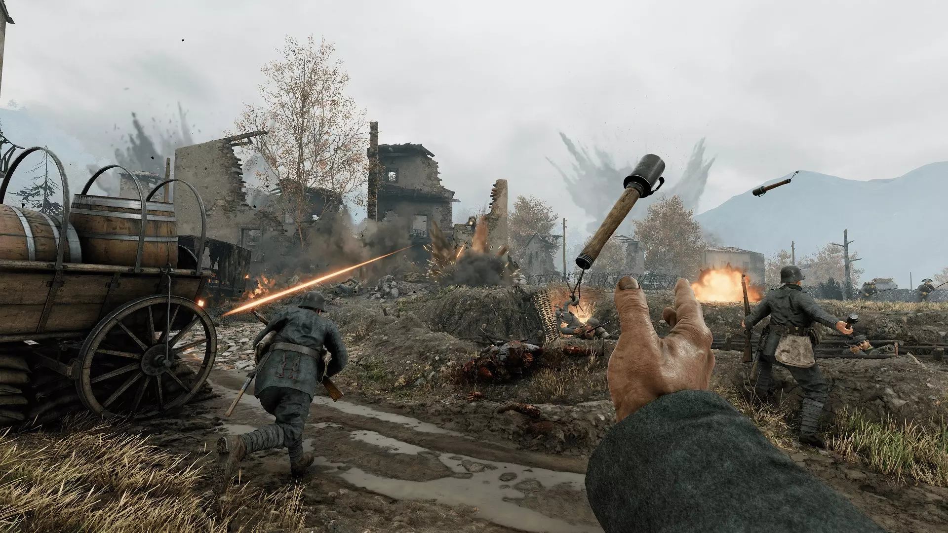 水壶:使用后可减轻爆炸和子弹造成的压制效果,并暂时消除耐力消耗,让你能在战场上更快移动。 军号:使用军号会在你周围产生临时光环,提升你和队友的栓动步枪射速与移动速度。 哨子:军官可使用哨子向团队下达命令,并暂时移除重生惩罚,让队友死亡后无需等待即可重生。 绷带:所有士兵均可使用,能治疗自身的重伤,但需要其他队友协助才能恢复至满血状态。军官呼叫支援 军官和山地兵可以向空中发射信号弹(使用地图瞄准),军官可通过信号弹呼叫地图外的炮火打击、毒气/烟雾攻击以及空中支援。若军官快速连续发射两枚信号弹,该信号弹落点处使用的支援能力将更强。各支援分支均有冷却时间,较弱的支援会先解锁,随后更强的支援会依次解锁。各支援分支如下: 炮兵营 - 可呼叫多种炮火打击,既可以是集中在一点的打击,也可以使用徐进弹幕沿一条直线落下炮弹。 化学团 - 可呼叫烟雾以掩护己方推进,或致命毒气以出其不意地打击行动迟缓或毫无防备的敌人。航空队 - 可呼叫侦察机侦察敌人动向、战斗机扫射敌方阵地,或轰炸机编队投弹对敌人进行猛烈轰炸。
