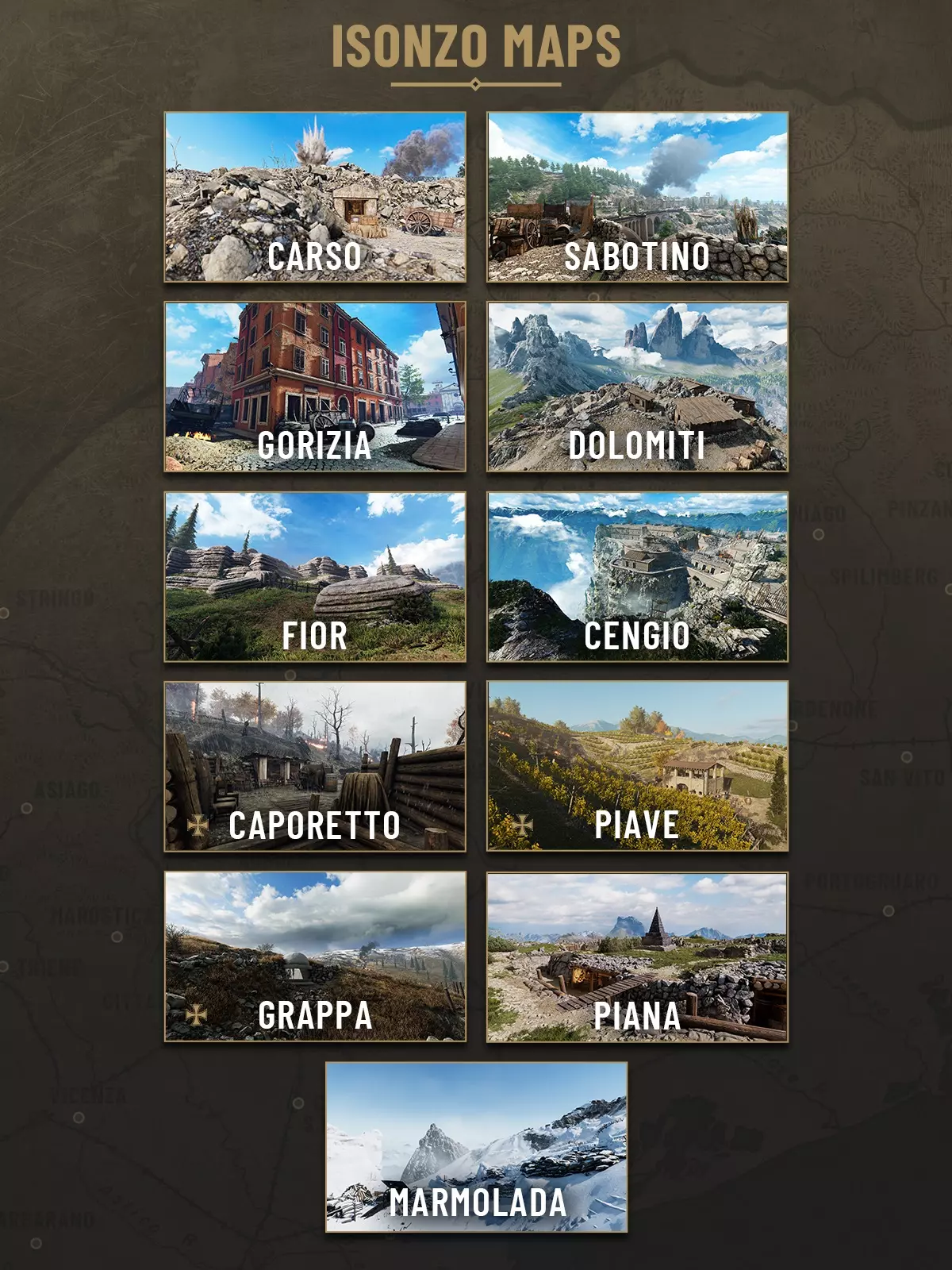 技能 每个角色都拥有能辅助特定游玩风格的特殊技能。你可以根据瞬息万变的战斗中所需的加成效果,选择并切换其中一项技能。通过提升职业等级,可以为该职业解锁更多技能。 地图 进攻战:山地战: 多洛米蒂 - 对“塞斯托岩”山峰发起英勇进攻。 皮亚纳 - 为夺取皮亚纳山的双子高原而展开的血腥反击。 斯特拉夫远征: 琴焦 - 在斯特拉夫远征期间,琴焦山和科尔宾堡垒曾是激烈山地战的发生地。 菲奥尔 - 斯特拉夫远征期间,阿西亚戈高原上的梅莱特山群峰争夺激烈。第六次伊松佐河战役: 卡尔索 - 整条战线上最血腥的山地之一,位于卡尔索高原边缘。 萨博蒂诺 - 戈里齐亚以北的战略高地,在第六次伊松佐河战役期间取得了重大突破。 戈里齐亚 - 1916年8月8日,在萨博蒂诺和圣米歇尔均取得突破后,戈里齐亚市被攻占。 德军干预: 卡波雷托 - 德军从托尔梅因桥头堡向科洛弗拉特山脊发起进攻。 皮亚韦 - 在皮亚韦河东岸的维多尔桥头堡进行殊死防御。 白色战争: 马尔莫拉达 - 横跨马尔莫拉达山群峰和破碎冰川的艰险进攻。