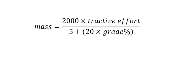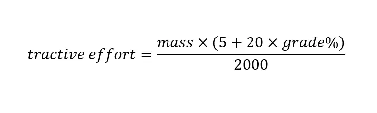 如果你只想直接获取公式,这里就是了。我甚至已经帮你转换好了。使用游戏内英制单位来计算牵引力和质量。实际应用计算结果时给自己留一些余量,弯道和轨道不平整会产生一些(轻微的)影响。需要多大的牵引力才能爬上坡?