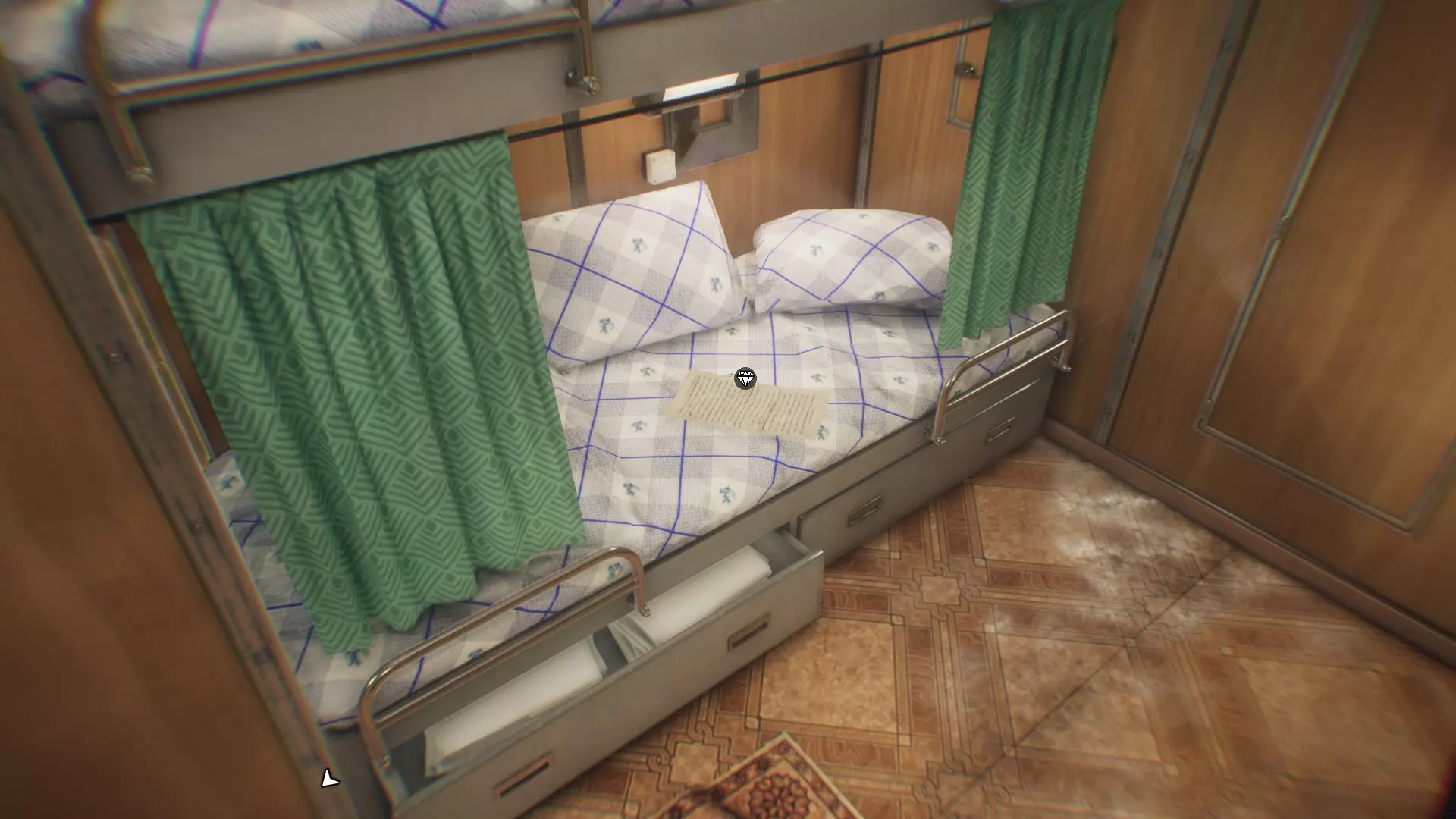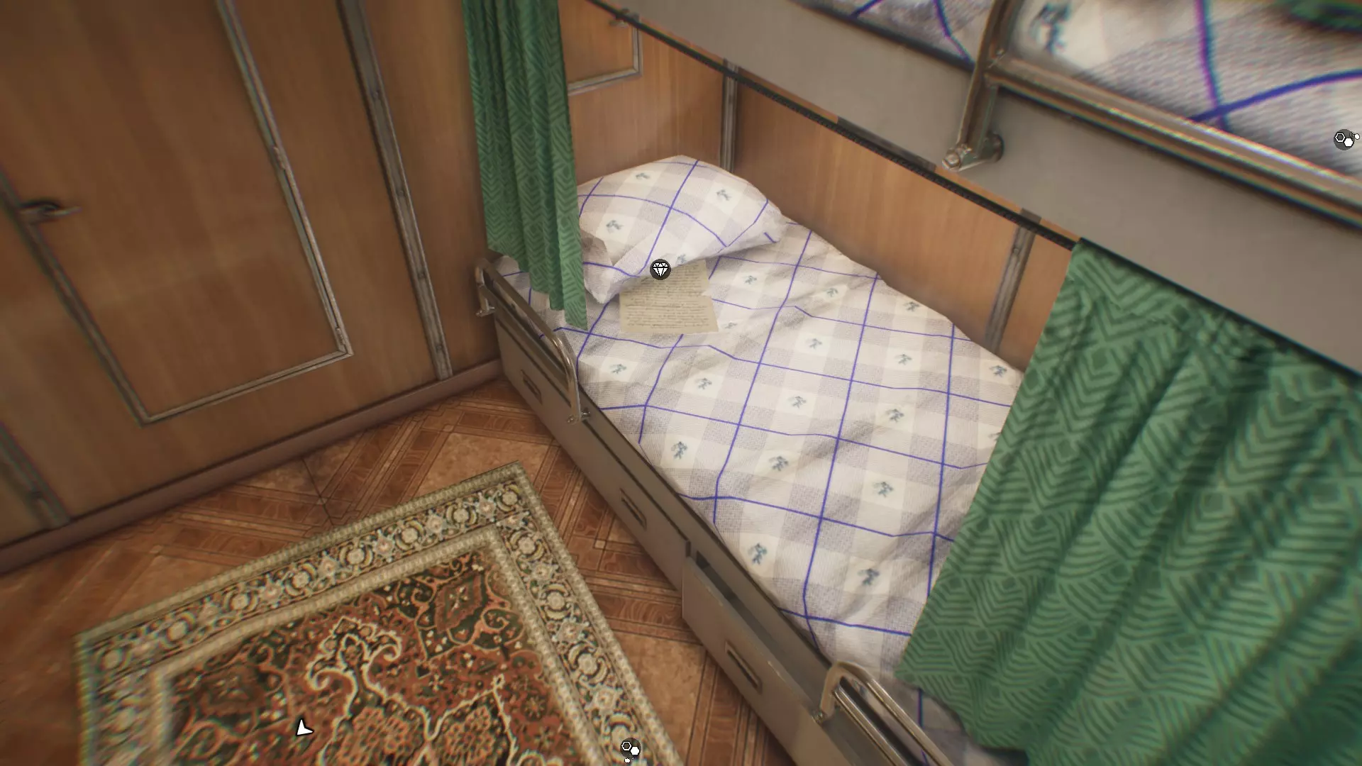 回到两层楼梯上方,进入4区。首先检查右侧的门,前两扇门现在无法打开。只有右侧第六个房间(需要撬锁)内有一个收藏品:一张便条。