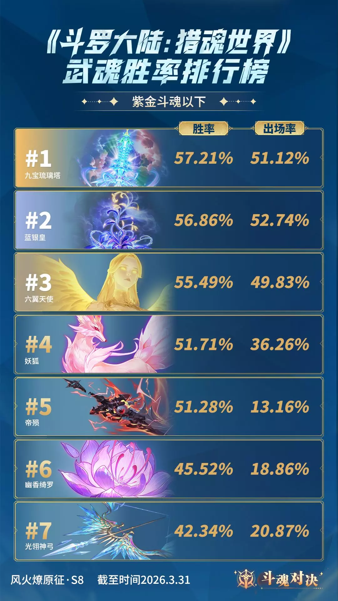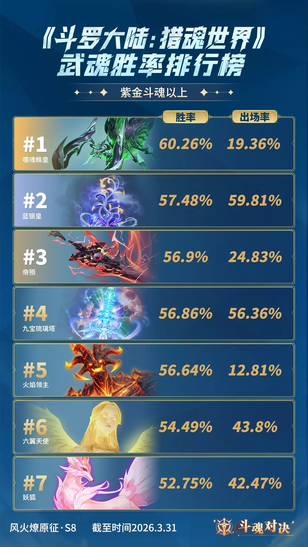《斗罗大陆:猎魂世界》斗魂对决S8赛季已结束,公布了2026年3月武魂胜率排行榜,紫金斗魂及以上段位前三为噬魂蛛皇、蓝银皇、帝殒;紫金斗魂以下段位前三为九宝琉璃塔、蓝银皇、六翼天使,同时S9赛季已开启。