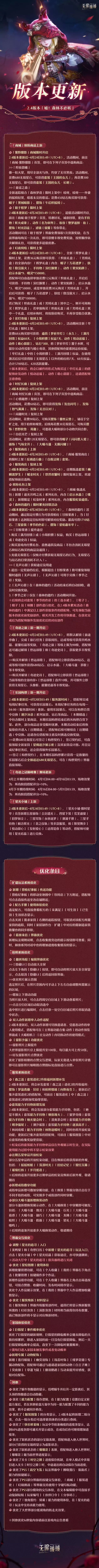 这是《无限暖暖》2.4版本「嘘!森林不必听」的更新内容,涵盖商城上新多款套装、礼包与活动,还有累充回馈、奇迹之旅等玩法开启,同时对玩法、拍照、服装等多系统进行优化,为玩家带来全新游戏体验。