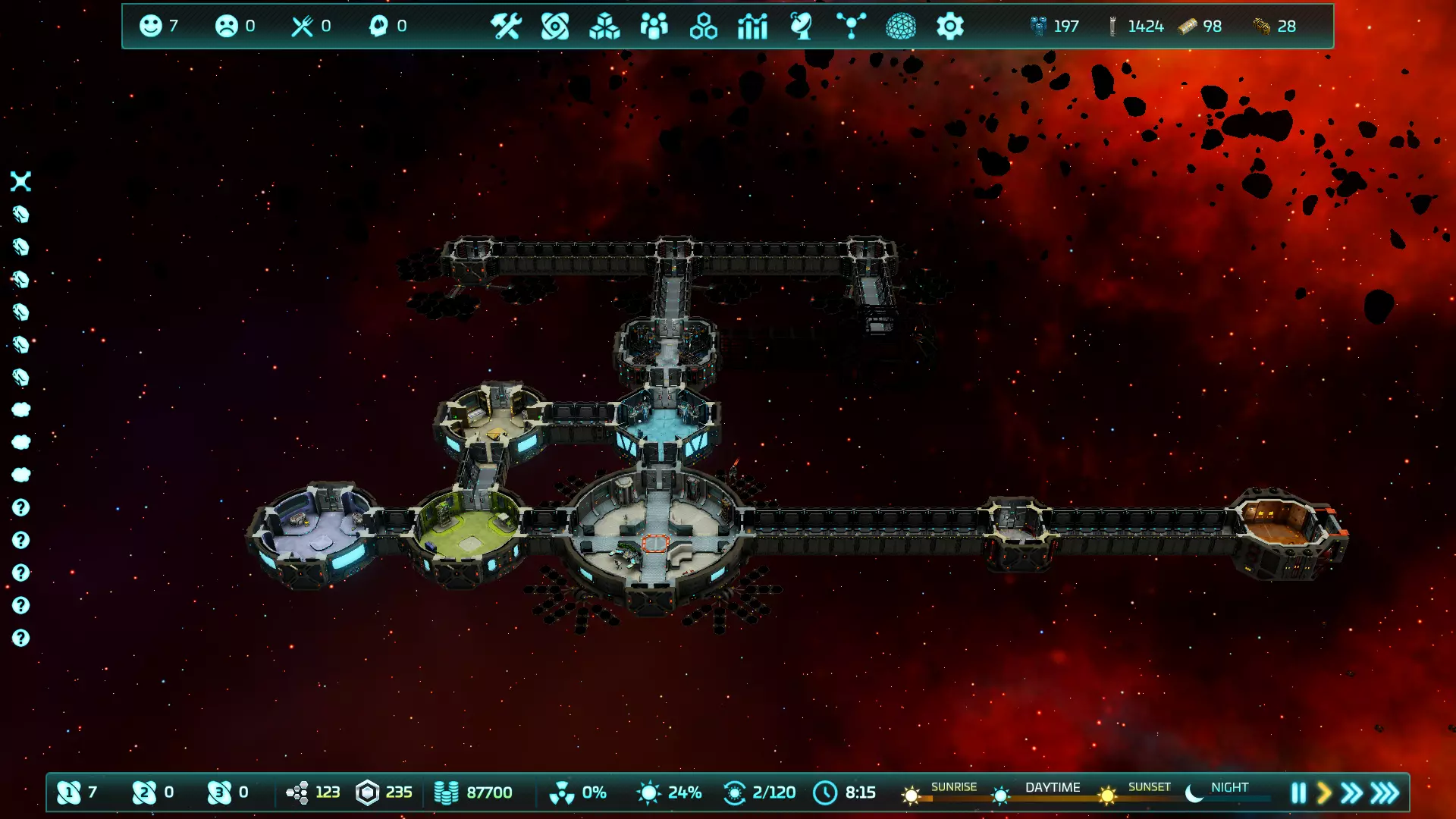 研究 第一个研究选项在10点时解锁,大约是凌晨2点。可用选项包括适应性、高级生命维持系统(ALS)、防御系统和制造。后两个选项目前并不相关(而且在简单模式下防御系统几乎完全无关),因此需要在适应性和ALS之间做出选择。适应性可以解锁健身房、训练中心和医疗舱的关键科技;而ALS能解锁循环系统(对于较大人口规模而言,淋浴/浴室是必需品),有助于快速建造大型空间站。如果想稍慢一点建造但让船员更快乐,可以选择适应性以解锁健身房。(除了需要睡觉的地方外,船员接下来会提出的抱怨将是“健身房训练怎么办?”)如果在普通或更高难度模式下游玩,你的船员会相对较快生病,因此你应优先建造医疗室(并雇佣医疗兵),然后再建造健身房。在最初的24小时结束时,你的空间站应该会是这个样子。