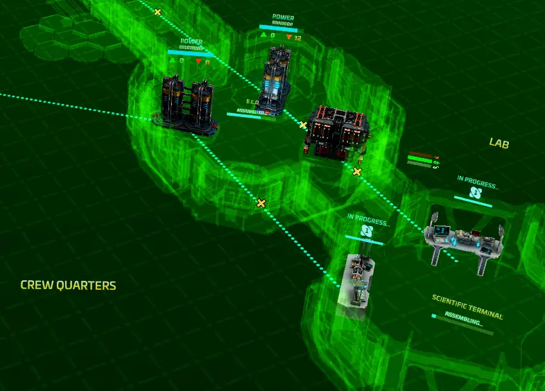 后续步骤(第二天及以后) 进一步建造 你可以开始建造额外的太阳能电池板(实际上每安装一个电池就需要一个),以及第二个生命维持模块,该模块配备两个电池和两个ELD,用于接下来的两个模块组。将所有电池与所有四个太阳能电池板交叉连接;这确实会降低每个电池的供电量,但能在某个太阳能电池板损坏时提供冗余保障。 进一步的建造将取决于你选择的科技路线:是适应分支的健身房和医疗舱,还是ALS分支的全尺寸生命维持模块和浴室。 额外的科学家/技术人员? 你可以雇佣更多此类人员以加快工作完成速度,但他们的成本更高。虽然在前几天最需要额外的科学家,但之后,你拥有的研究点数总会多于你能使用的数量。仅用两名科学家,在五周内研究完所有科技是有可能的,而最大的阻碍是缺乏足够的T3科学点数。 你可以在科学家(或任何人)不再有用时解雇他们,但解雇会消耗你的LP。你最终需要更多的技术人员,但在建造浴室模块之前雇佣的人越多,就越有可能遇到卫生问题。 幸福度重要吗? 重要。船员越快乐,工作效率就越高,这也会影响你的每周报告。(快乐船员会为你赚取LP,不快乐船员则会让你损失LP。 进一步研究: 开始探针和计算机的研究需要投入大量初始资源;你需要开始探测星系,特别是寻找碎片和异常现象(它们能为你提供免费的科学点数),并且需要研发光谱分析仪,之后再研发主机,以获取T2和T3科学点数,而这些都是研发更高级技术所必需的。如果你先研究较便宜的技术,例如训练中心和医疗舱,当它们研发完成并建造好相关模块后,你很可能会有一定的研究盈余,可将其用于更昂贵的技术研发。提前规划 训练中心有助于提升人员的表现。 下一阶段的研究应优先考虑无人机,以便扫描区域资源并进行开采。在至少开采一天资源且制造人员有原材料可用之前,开展制造研究是没有意义的。