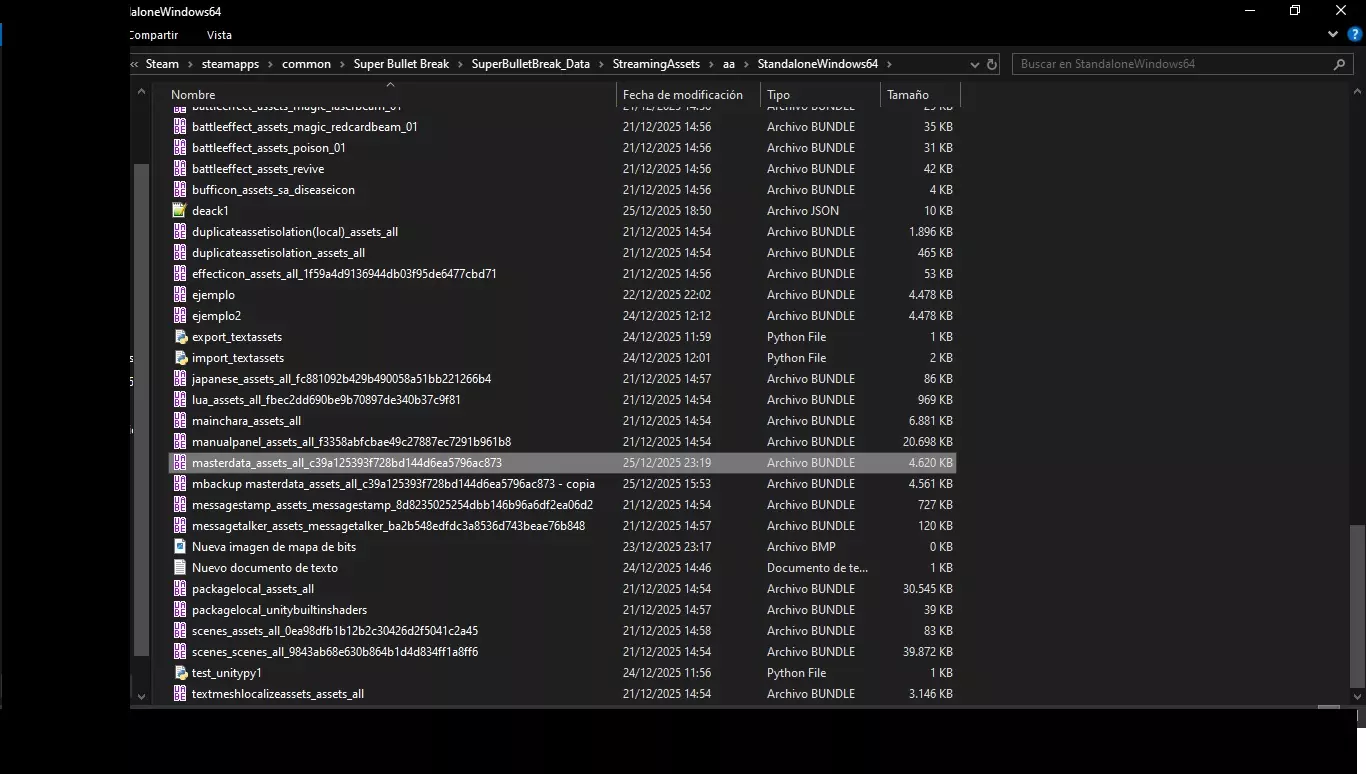 所有程序都会修改文件:masterdata_assets_all_c39a125393f728bd144d6ea5796ac873 该文件位于游戏文件夹【超级子弹娘】SuperBulletBreak_Data StreamingAssets aa StandaloneWindows64中