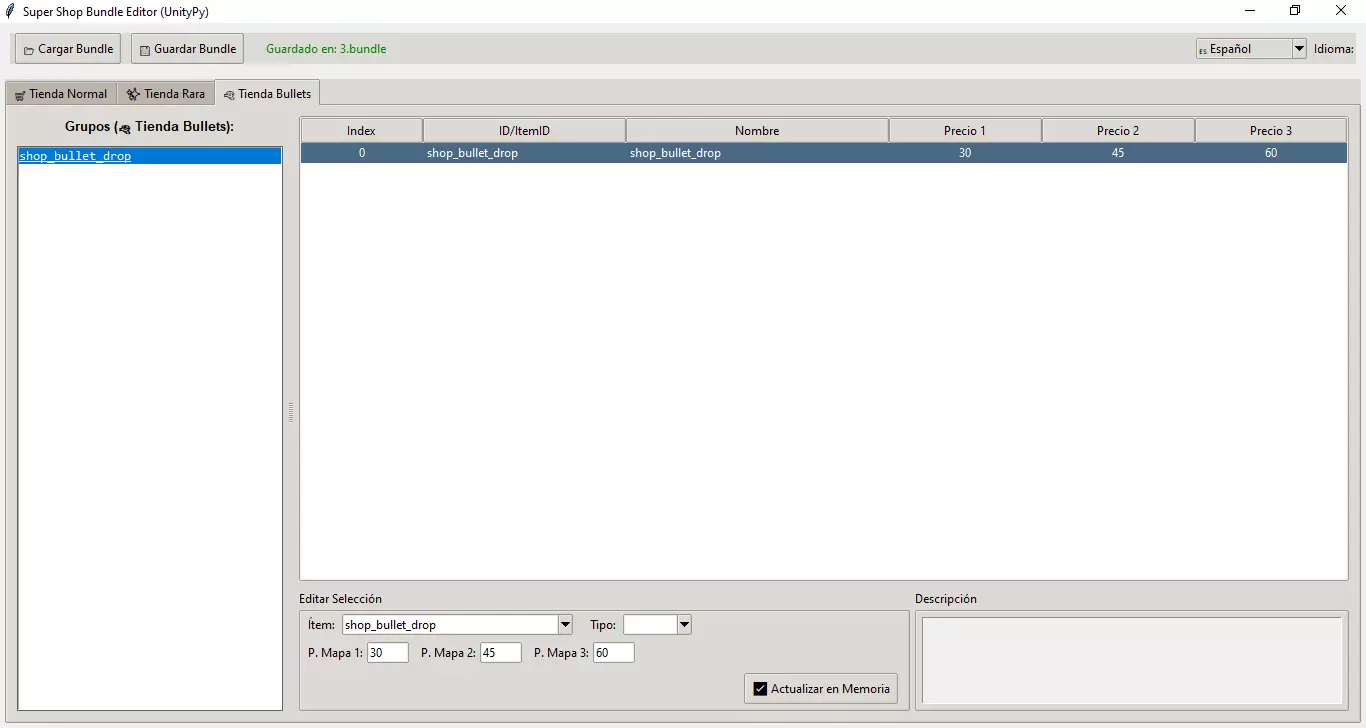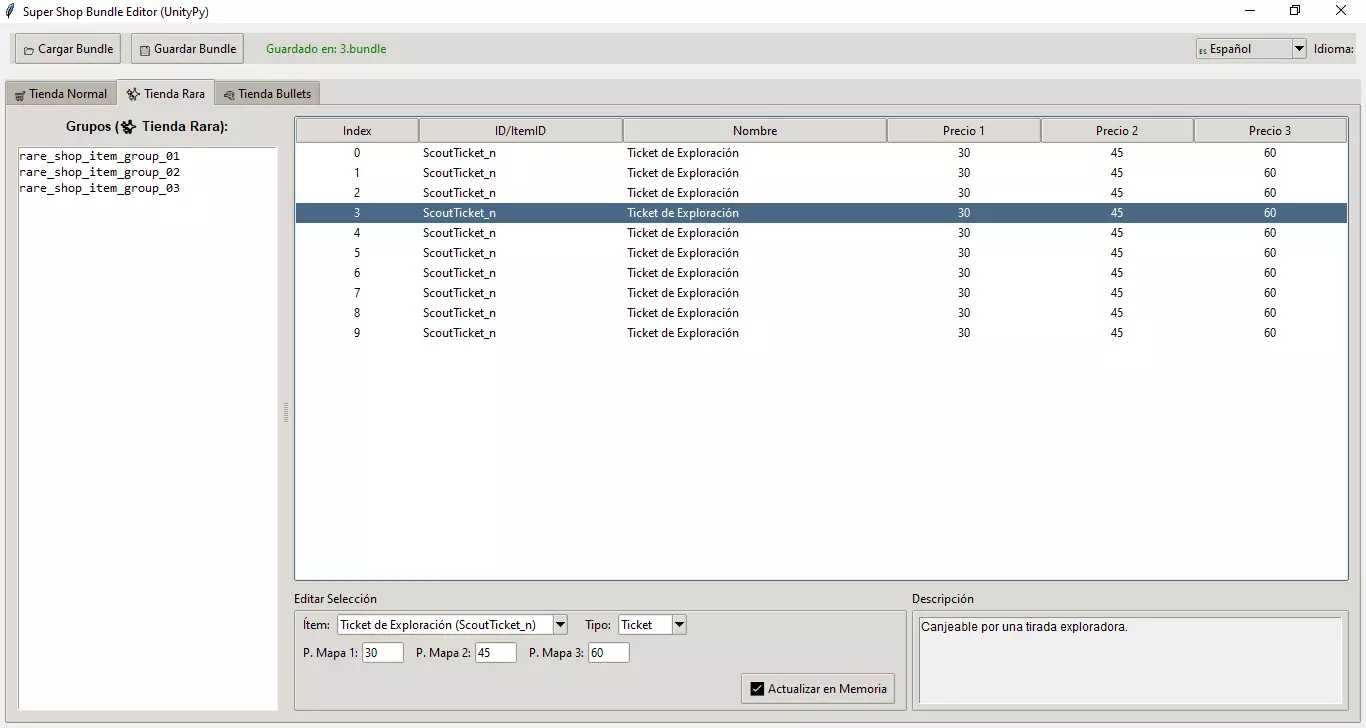 1. 加载文件:点击【加载Bundle】。 2. 选择常用的主文件:masterdata_assets_all_c39a125393f728bd144d6ea5796ac873.bundle。 3. 程序将自动读取物品数据库,以便在菜单中显示真实名称。 4. 商店类型:编辑器有三个主要标签页(游戏代码中如此设置,具体在游戏内的显示方式尚不明确): - 普通商店:出现在标准商店格子中的常见物品。 - 稀有商店:出现在事件节点或稀有商店中的特殊物品。 - 子弹商店:用于购买角色(Bullets)的特定设置。如何编辑价格和物品 在左侧列表中选择一个组(这些是游戏随机选择的不同库存组合)。 在中央表格中,选择你想要修改的物品。 在下方的“编辑选择”中,你可以进行以下修改: - 物品:选择要出售的物品(可按名称搜索)。 - 价格(地图1、2、3):物品的成本。 点击“更新内存”以确认更改。 多价格:你会看到“地图1价格”“地图2价格”等。我们推测游戏中越往后价格越高,但这并非绝对。 未知组:商店有许多“组”。其中一些可能来自过去的活动或特定游戏模式。 4. 保存 一如既往: 1. 点击“保存捆绑包”。 2.覆盖原始文件。