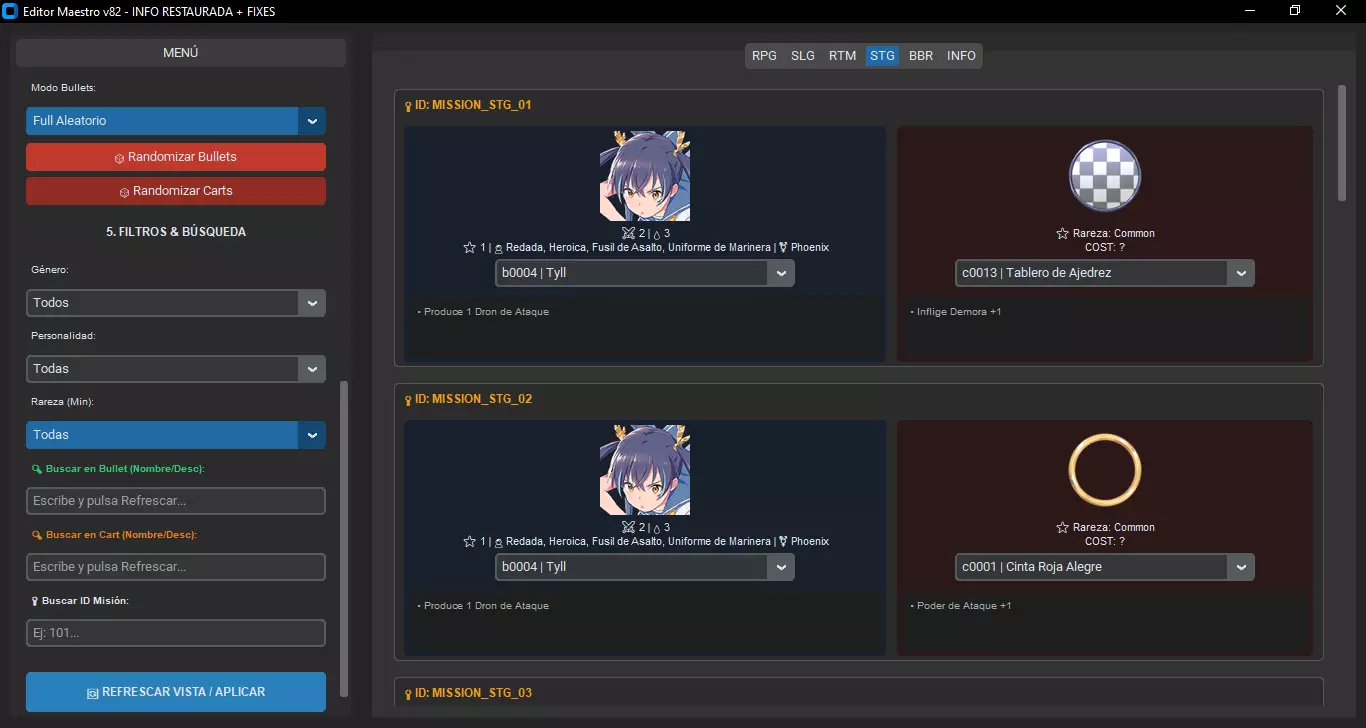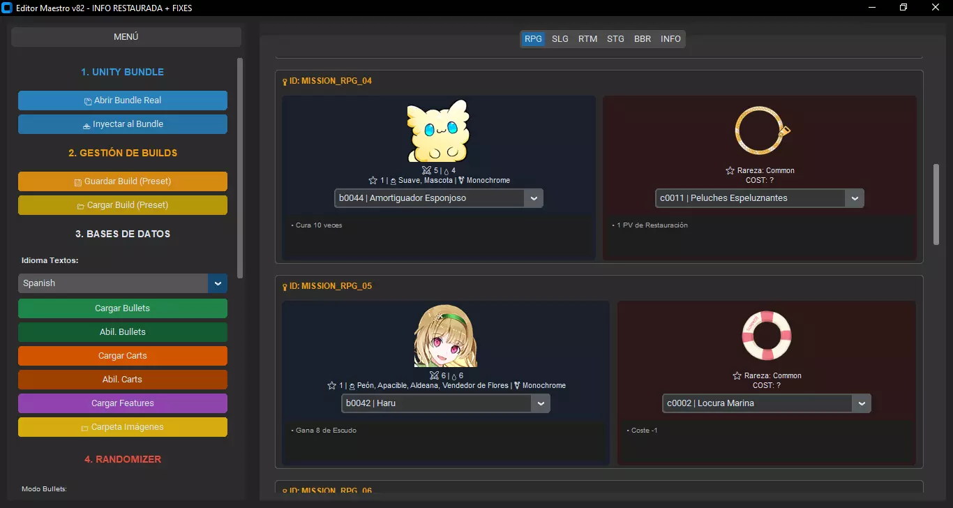 1. 前期准备 为确保程序以最佳状态自动运行,请将编辑器可执行文件与提取出的JSON文件(Bullet.json、Cart.json等)放在同一文件夹中。(默认情况下已如此,无需过多关注) 若文件位置正确,程序在打开时将自动加载数据库。 无需手动使用“加载子弹/购物车”按钮。 2. 加载游戏文件 在侧边菜单的“1. UNITY BUNDLE”下,点击“打开真实Bundle”。 导航至游戏文件夹,找到包含主数据的特定文件。 选择文件:masterdata_assets_all_c39a125393f728bd144d6ea5796ac873。注意:若你加载了正确的文件,你会看到中间的标签页(RPG、SLG等)会填充牌组信息。 3. 卡牌编辑 加载完成后,你可以通过两种方式进行编辑: A. 手动编辑 前往中间的标签页。每张卡片代表牌组中的一个槽位: 使用下拉菜单来更改子弹娘(角色)或支援卡。 左侧的搜索器(“筛选与搜索”)可帮助你通过名称或描述查找卡牌,如果你不记得ID的话。 B. 随机生成器 如果你想尝试一下,可以前往侧边栏的“4. 随机生成器”部分。 你可以仅随机生成子弹娘或支援卡。该程序包含一个智能算法(“集群”或“团队”),如果你选择“共享个性”等选项,它会尝试保持一定的协同性。 4. 语言设置 在“3. 数据库”部分,你可能需要调整的唯一设置是“文本语言”菜单。 将其更改为西班牙语、英语等,以便在编辑器中以你偏好的语言查看卡牌名称。 更改语言后请记得点击【刷新视图】以更新文本。 5. 保存并游戏 完成更改后: 点击【注入到Bundle】。 保存新文件。为了让游戏识别你的更改,你必须覆盖原始文件或将其保存为完全相同的名称:masterdata_assets_all_c39a125393f728bd144d6ea5796ac873。捆绑包:关闭编辑器并打开游戏! 关卡编辑器.exe 关卡编辑器(Stage Editor)此工具用于修改奖励参数。