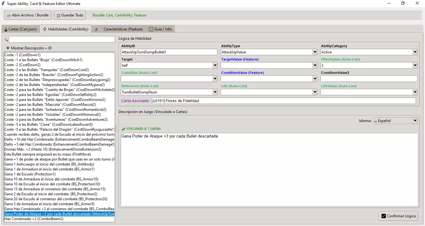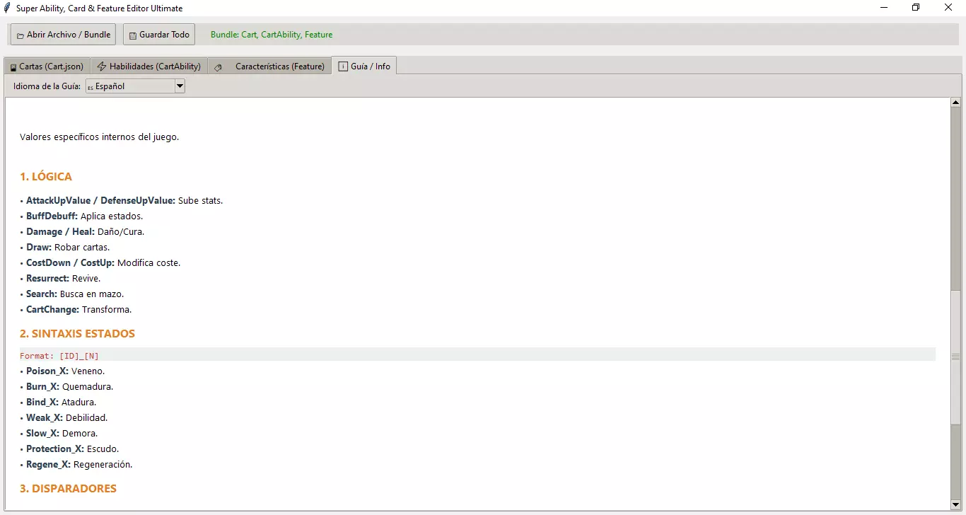 1. 加载文件 和其他工具一样,此工具通过修改游戏主文件来运行。 点击【打开文件/Bundle】。 选择常用文件:masterdata_assets_all_c39a125393f728bd144d6ea5796ac873.bundle 此时你会看到顶部的标签页(卡牌、技能、特性)被激活。 2. "Cart"与"技能"的区别 要创建自定义卡牌,你需要了解游戏如何分离数据: Cart(Cart.json):是视觉上的"外壳"。在这里定义名称、玩家看到的描述以及稀有度。 技能(CartAbility.json):是"核心"。在这里定义程序设定:造成多少伤害、影响目标以及何时激活。 一张"卡牌"必须通过ID(AbilityID)与一个"技能"相关联。 3.标签指南 标签1:卡牌(视觉) 用于翻译或修改卡牌名称。 从左侧列表中选择一张卡牌。 视觉文本:可修改名称和描述。编辑前请记得选择正确的语言(例如:西班牙语)。 技术数据: - 技能ID(逻辑链接):此数字将卡牌与其效果关联。若创建新技能,请在此处填写其ID。 - 稀有度:修改卡牌边框(普通、稀有、传说)。 标签2:技能(逻辑) 这里是实现魔法的地方。若想让卡牌造成9999点伤害或治疗全体队友,可在此处编辑。 左侧列表:显示现有技能。可勾选“显示描述”查看技能效果。编辑字段: - 效果值:威力(伤害、治疗量、中毒回合数)。 - 目标:影响对象(敌人、玩家、全体)。 - 条件:激活时机(攻击时、战斗开始时等)。 紫色信息栏:编辑器会自动显示你当前正在编辑的技能来自游戏中的哪张卡牌。 额外标签页:ℹ️ 指南/信息 无需记忆各个代码的作用。程序内置百科全书。 进入最后一个标签页 ℹ️ 指南/信息。 在下拉菜单中选择“西班牙语”。 你将获得一份完整的术语词典,解释每个技术术语的含义(攻击提升、治疗、中毒等)。 4. 保存更改 完成最终卡牌创建后: 点击“全部保存”。覆盖原始文件以应用游戏变更: masterdata_assets_all_c39a125393f728bd144d6ea5796ac873.bundle Enemy Editor.exe 敌人与难度编辑器 此工具允许你调整生命值、伤害和回合数。它能够同时读取和修改Enemy与EnemyAction。