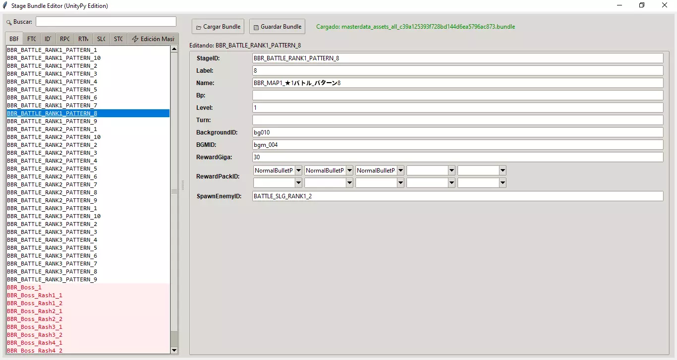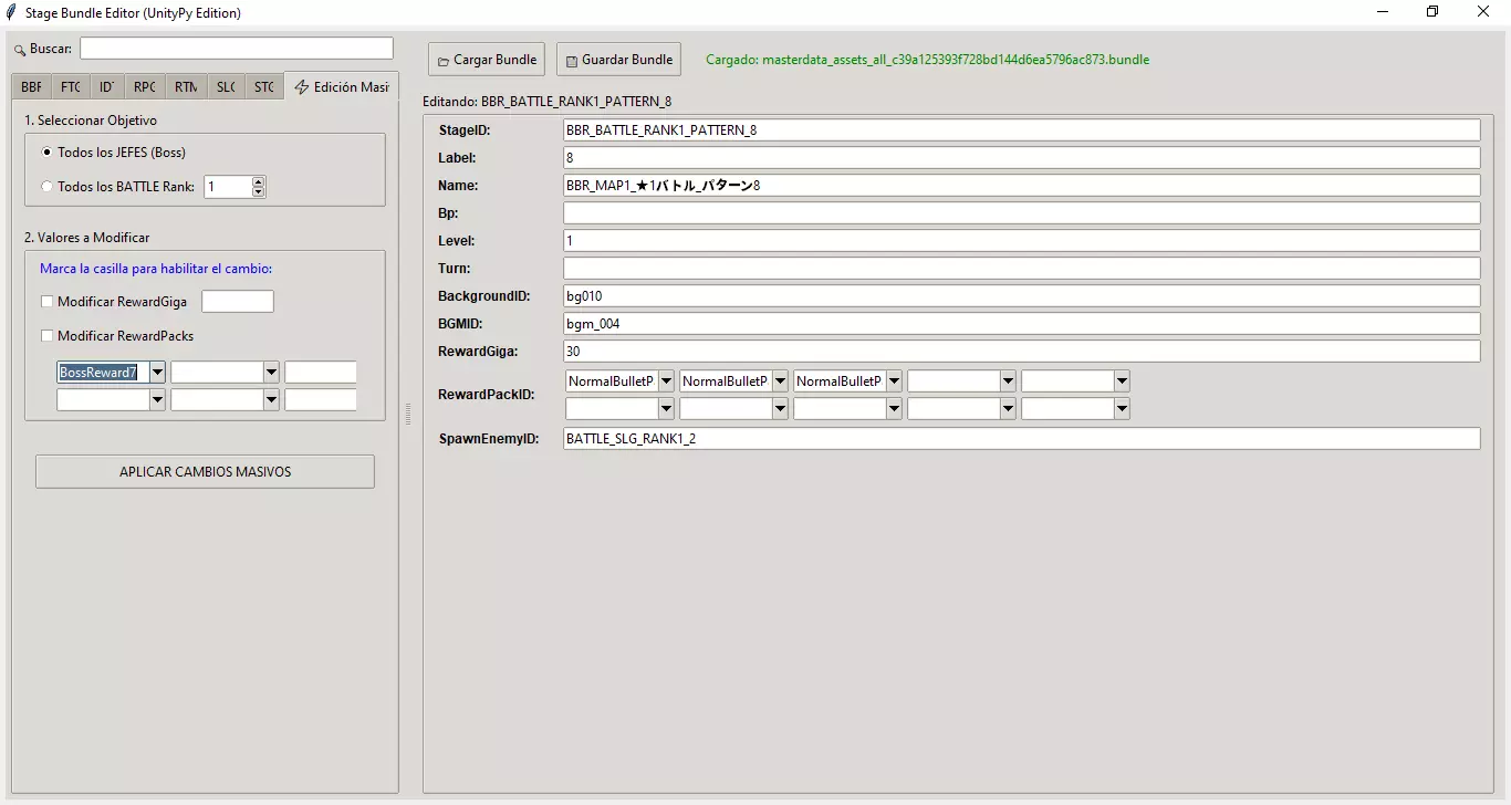 1. 加载文件 和卡组编辑器一样,此程序运行于主数据文件之上。 点击【加载数据包】。 选择你之前使用过的同一文件:masterdata_assets_all_c39a125393f728bd144d6ea5796ac873.bundle 等待几秒钟,直到状态栏显示“已加载”且左侧列表出现。 2. 关键概念:奖励 你会看到许多数字字段,但为了方便游戏,重点关注以下两个: 【RewardGiga】:完成关卡时获得的金钱数量。 【RewardPackID】:物品奖励,具体为卡牌(通常是1星、2星或3星,也有活动或首领等其他奖励)。 3. 编辑模式 A.单人模式(精准模式) 使用左侧面板浏览分类(角色扮演、战斗等)。 标有【红色】的关卡为头目关卡。 选择关卡后,可在右侧编辑其数值。 可使用“RewardPackID”行中的下拉菜单添加多张奖励卡片(添加超过3个奖励无效,已测试)。 B. 批量编辑(特殊标签页) 这是程序中最强大的功能,可同时修改数百个关卡。进入左侧菜单的最后一个标签页【批量编辑】。 步骤1:选择目标 你可以选择将更改应用于: 游戏中的所有头目。 特定等级的所有敌人(例如:等级1对应初期敌人)。(等级=Estrella) 步骤2:设置数值 勾选你想要覆盖的选项框: 勾选【修改RewardGiga】并输入数值(例如:9999),这样所有敌人都会掉落大量金钱。 勾选【修改RewardPacks】并在下拉菜单中选择卡牌,这样所有敌人都会掉落该等级的卡牌。最后,点击【应用批量更改】。 4. 保存更改 点击【保存Bundle】。 覆盖原始文件(或使用相同名称保存)以应用模组: masterdata_assets_all_c39a125393f728bd144d6ea5796ac873.bundle Cart Editor.exe 卡牌与技能编辑器(终极编辑器) 这是最先进的编辑器。它不仅允许你更改卡牌文本,还能完全重新编程卡牌效果(伤害、治疗、条件等)。