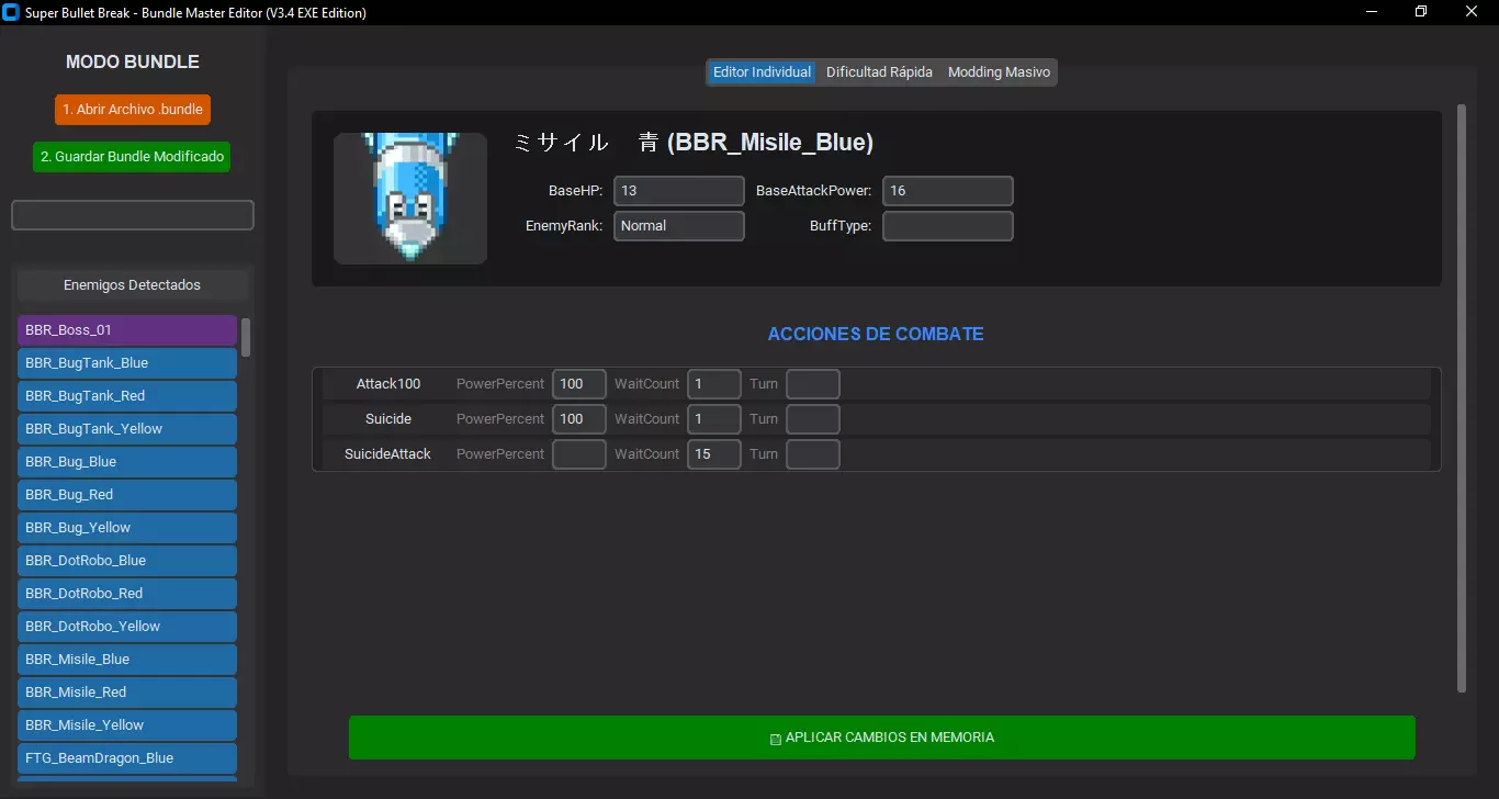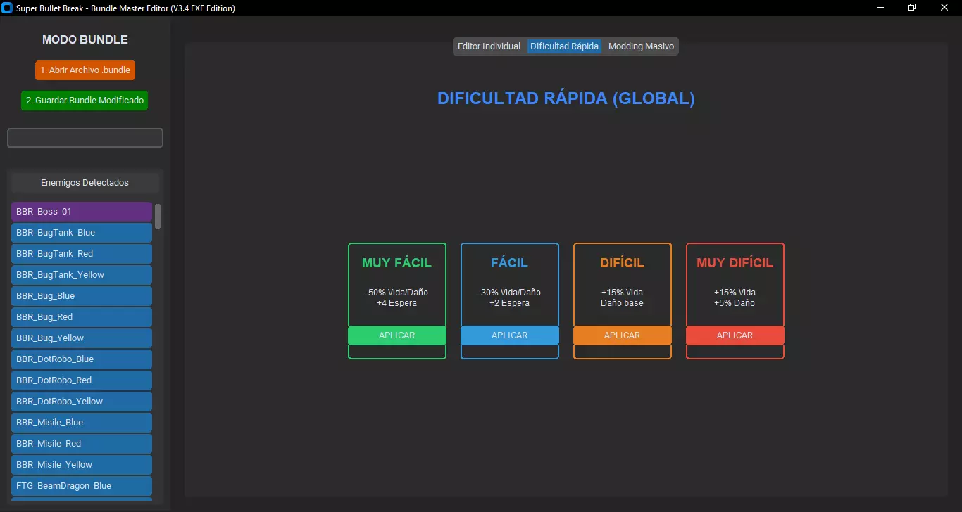 1. 加载文件:点击橙色按钮“打开 .bundle 文件”。 2. 选择主文件:masterdata_assets_all_c39a125393f728bd144d6ea5796ac873.bundle 3. 如果一切正常,你将在左侧看到敌人列表。 注意:“快速难度”标签页 此标签页旨在通过一次点击对整个游戏应用全局更改(例如,将所有敌人的生命值降低50%)。 >>> 操作前请阅读 <<< 该系统以累积且不可撤销的方式运行。 累积效果:如果你点击一次“困难”按钮(+15%生命值),敌人将拥有115%的生命值。如果你再次点击,将在新值的基础上计算15%(达到约132%)。如果你点击5次,敌人将变为无敌状态! 无法撤销:没有“撤销”按钮。更改会立即应用到程序内存中。 出错解决方法:如果错误应用了预设或应用次数过多,你必须关闭程序并从头重新加载原始数据包。 3. 其他编辑模式 A. 单独编辑 适合调整特定首领。 从左侧列表中选择一个敌人(可使用搜索筛选)。 你将看到它们的基础属性(生命值、攻击力)以及下方的行动列表(特定攻击)。 等待计数:敌人蓄力攻击所需的时间。降低此数值会使其更具攻击性;提高此数值会使其变慢。 B.大规模模组制作 如果你想创建特定的模组(例如:“Boss Rush模式”,在该模式中只有Boss变强)。 目标:选择影响“所有敌人”、仅“普通敌人”或仅“Boss”。 属性:你想要更改的属性(生命值、伤害、等待时间)。 数值与类型:你可以添加固定数值(例如:+500生命值)或百分比(例如:+20%)。 4. 保存更改 完成难度调整后: 1. 点击绿色按钮 2. 保存已修改的模组包。 2. 覆盖原始文件以将更改应用到游戏中。 Shop Editor.exe 商店编辑器(Shop Bundle Editor) 觉得物品价格太贵?这个工具允许你修改游戏商店的物品价格。