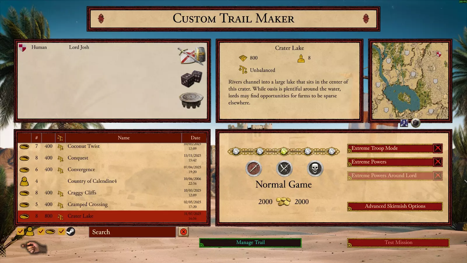 现在我们可以按照设置任何自定义遭遇战游戏的方式来创建任务。选择你喜欢的任何地图,在本示例中我会选择【峡谷山脊】。 一旦你选择了地图,只需按照你喜欢的方式设置任务。我会添加几个游牧CPU领主,分散在地图各处,并创建一个电脑具有巨大优势的死亡竞赛游戏。(你不必完全照搬这种布局,你可以创建自己的布局,或者使用自定义地图!)