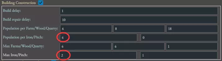 在此界面,我们首先要找到【建筑建造】部分,将【每单位铁所需人口】的值从0修改为6。然后将【最大铁量】的值从1更改为2。