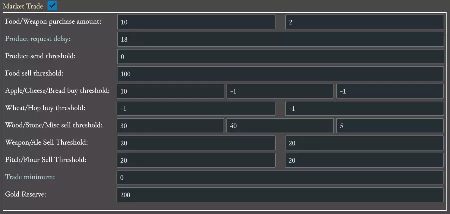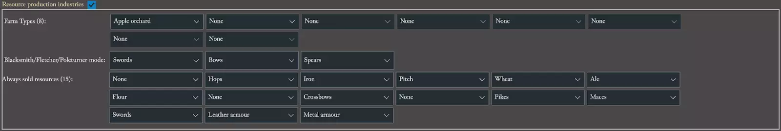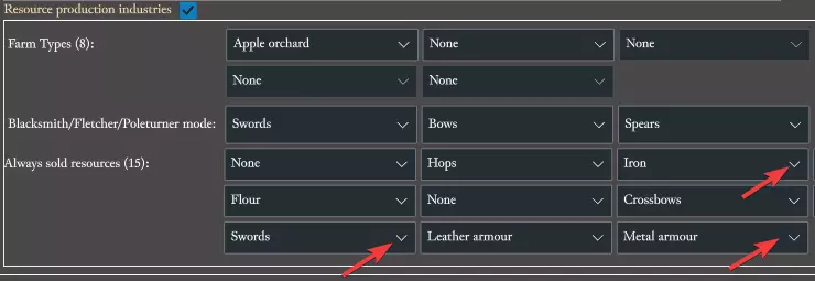 你的新鼠王现在会等到人口达到6个农民后才尝试建造铁矿,并且最多建造2个铁矿。 在建造建筑部分的正下方是资源生产产业部分。在这里我们可以看到铁匠铺已经设置为生产剑而非钉头锤,因此我们无需在那里进行任何更改。该设置下方是始终出售部分,在这里我们需要将铁、剑和金属盔甲更改为无,以阻止鼠王出售我们所需的资源。 注意:无选项位于下拉列表的顶部。