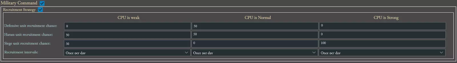 军事指挥 军事指挥。在本部分中,你可以调整CPU领主发动攻击的概率,以及他们尝试招募部队的间隔时间。将鼠标悬停在文字上可查看各项的详细说明。
