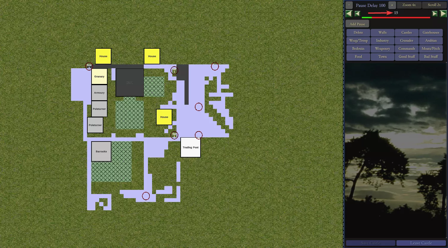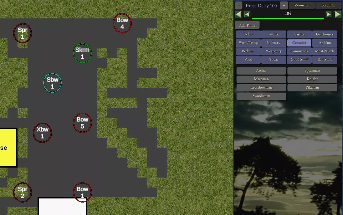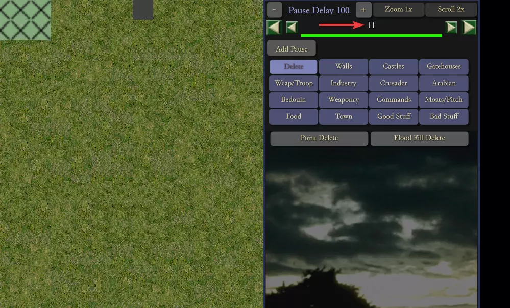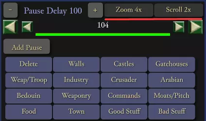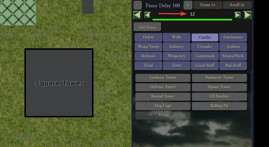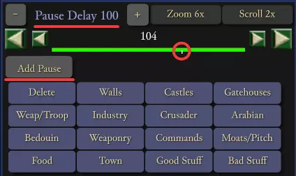 暂停延迟 点击【添加暂停】按钮可在建筑放置之间添加延迟。显示的数字为城堡建造过程中每步之间的延迟,单位为50游戏刻。例如,暂停延迟100即为5000刻,相当于125秒。使用【+】和【-】按钮可增减延迟时间。 若CPU领主也在等待资源,暂停延迟可能会被掩盖。例如,若其建造了半个城堡后因等待石料而停滞数分钟,期间原定的暂停延迟将会在等待石料的过程中自动度过。 注意:暂停延迟的数值为全局设置,适用于所有添加的延迟。无法设置一个延迟为50,另一个为100。不存在按延迟单独设置数值的功能。如果你放置5个延迟器并设为100,然后将数值改为50,那么所有延迟器都会变为50。