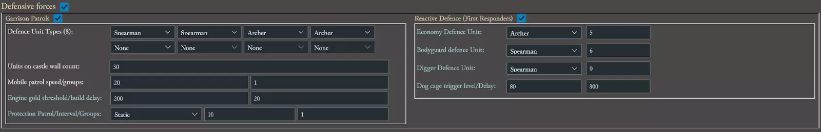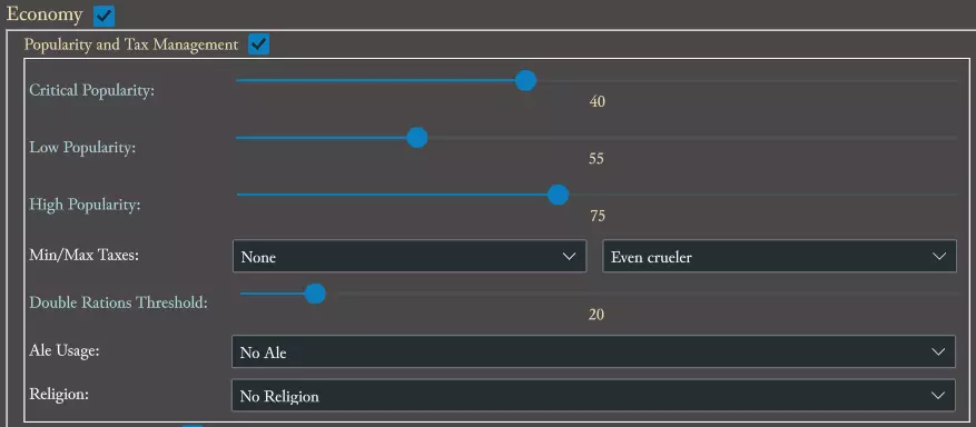 保存你的新城堡设计 当你对CPU领主的城堡建造方式满意后,点击【保存城堡】将设计保存到你的电脑中。 点击【离开城堡】返回主菜单。 新领主配置(用于创建AIC) 领主配置界面是你自定义CPU领主游戏方式的地方。这个界面乍一看可能会让人觉得复杂,但创建一个简单的AIC并不需要太多步骤。这里最重要的一点是:如果你在某个部分添加了CPU领主之前不会使用的新资源/部队类型,你必须检查其他区域,确保他们不会出售新资源/会实际招募该部队。 提示:任何蓝色高亮的文本都有包含选项解释的工具提示。经济系统 经济板块用于设置税收、食物配给、民众支持度,以及啤酒消耗和宗教相关内容。需要注意的一点是,这一点也适用于其他许多板块:如果选择的领主原本不建造啤酒花农场,但启用了啤酒消耗功能,那么就必须在领主编辑器的其他区域,将啤酒花农场设为可建造农场,同时关闭所有啤酒和啤酒花的自动售卖。这些选项可在市场贸易和资源生产产业中找到。此外,还需要编辑电脑领主的城堡,使其能够建造酿酒厂和酒馆。