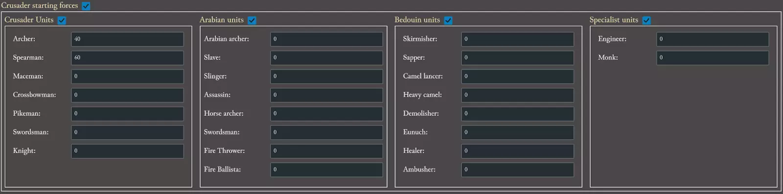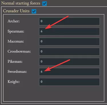 接下来是初始部队部分。我们将修改普通难度的初始部队,把长矛兵数量从12个减少到6个,并在十字军单位部分添加6个剑士。