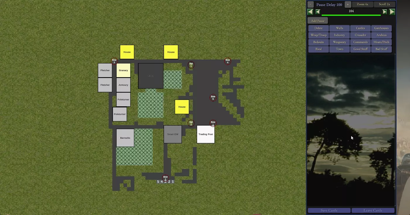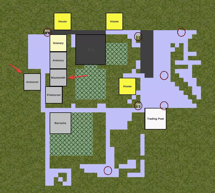 现在我们处于城堡编辑器界面,可以缩小视图以查看整个城堡。在左侧能看到军械库和武器工坊。我们的老鼠(Rat)要训练剑士和长矛兵,所以不需要两个长柄武器工坊。直接删除一个长柄武器工坊,再放置铁匠铺和盔甲铺的做法效率不高,这是因为右上角的建造序列号。如果那样做,新的铁匠铺和盔甲铺要等城堡里其他所有建筑都建造完成后才能开始建造。