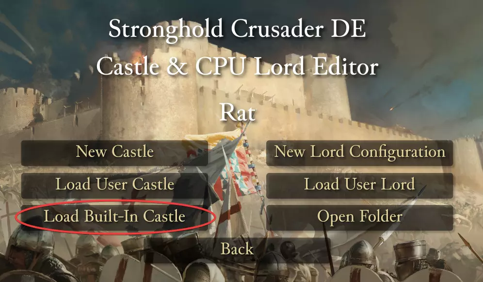 创建城堡 - 攻略 为了帮助你入门,我们来制作一个简单的自定义老鼠领主,它会建造铁矿、用金属盔甲打造长剑,并在军队中招募剑士。 既然我们已经知道要做哪些改动,就可以开始编辑城堡了。 步骤1:城堡编辑器 选择老鼠作为要编辑的领主,然后选择加载内置城堡。
