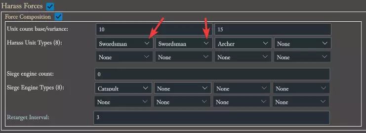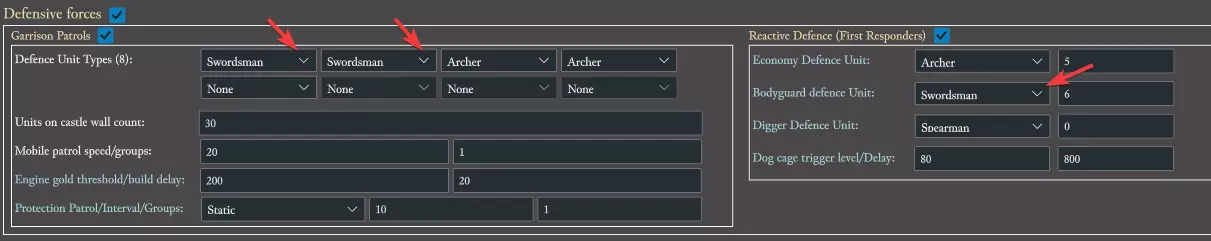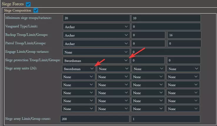 向下滚动,我们会找到【部队】部分。在这3个部分中,我们要将所有下拉菜单中的【长矛兵】更改为【剑士】,以确保鼠王使用剑士。不要更改【挖掘者防御单位】,因为剑士无法挖掘。最终结果应如下所示: