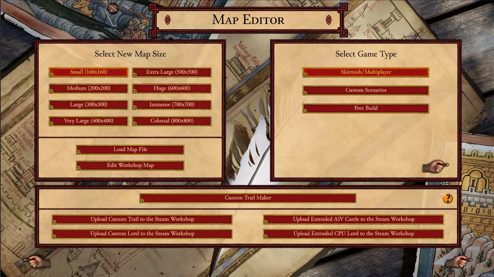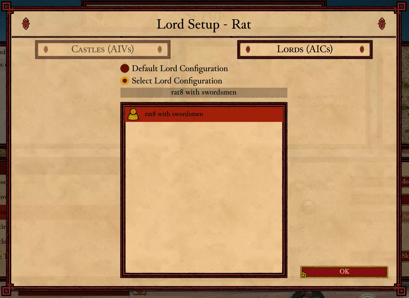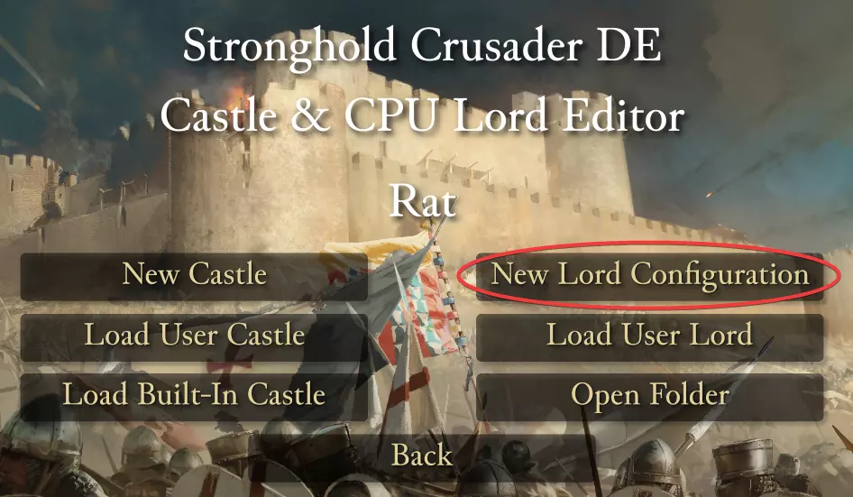 点击保存将您的更改保存到领主编辑器文件中。现在我们拥有了城堡AIV文件和老鼠的自定义AIC文件,这两个文件都可以通过主游戏加载。 步骤3:测试您的新领主。领主配置 关闭城堡与CPU领主编辑器,打开《要塞十字军东征:决定版》。进入游戏后,导航至自定义遭遇战界面,选择一张有铁矿资源的地图,并添加老鼠作为对手。若要更改CPU领主使用的AIV和AIC文件,点击CPU领主旁边的问号即可。