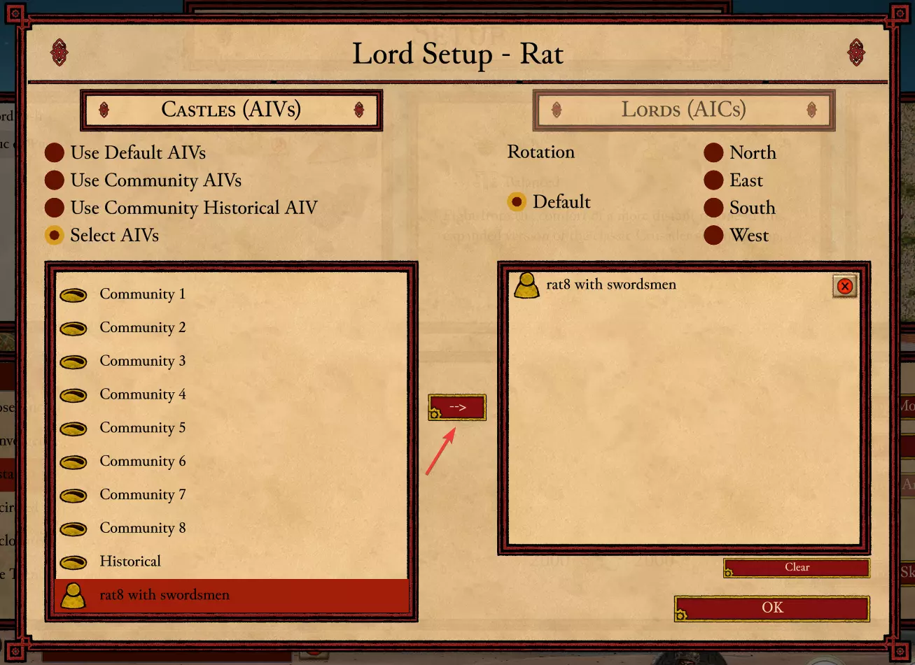 这将打开领主设置界面,你可以在此选择老鼠领主使用的AI领主组合。在领主设置界面中,若我们开启选择AI领主选项,就能移除或添加任意AI领主。移除全部8个默认AI领主,然后在左侧向下滚动,找到你之前创建的AI领主,双击它或将其选中后点击屏幕中央的箭头来添加。